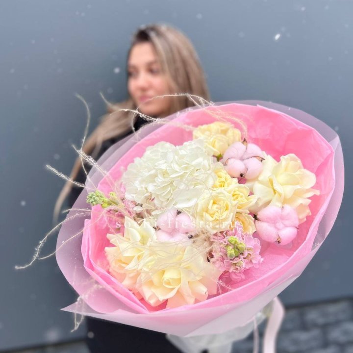 Букет кустовые розы и гортензия