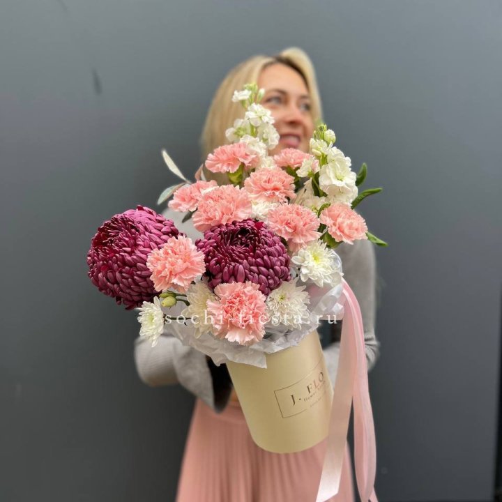 Хризантемы с маттиолой розами эустомой Чика