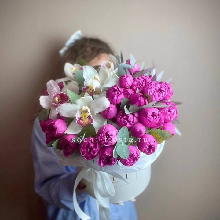Орхидея и эустома в шляпной коробке