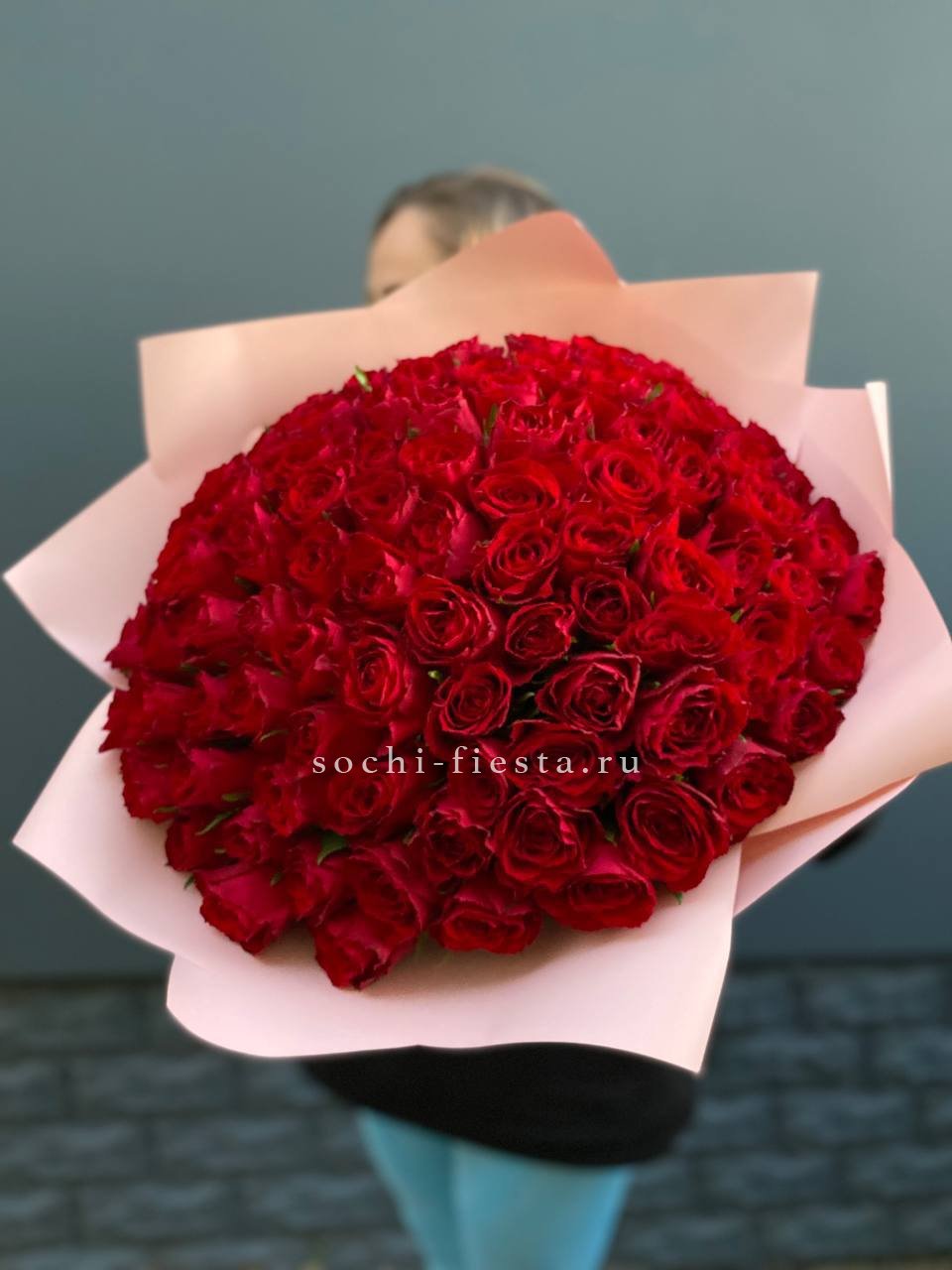 Сто одна роза Madam Red образует объёмное цветовое пятно с глубоким красным оттенком. Букет занимает пространство и сразу притягивает внимание своей насыщенностью.