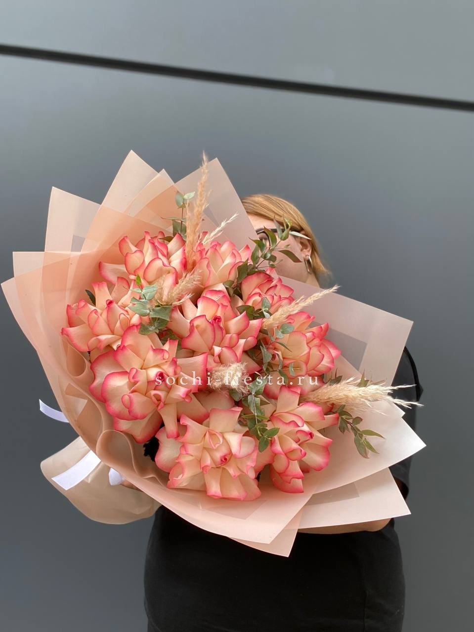 Одиннадцать французских роз выстроены в округлую композицию с веточками эвкалипта. Бутоны крупные и плотные, держат форму и наполняют пространство свежим присутствием.