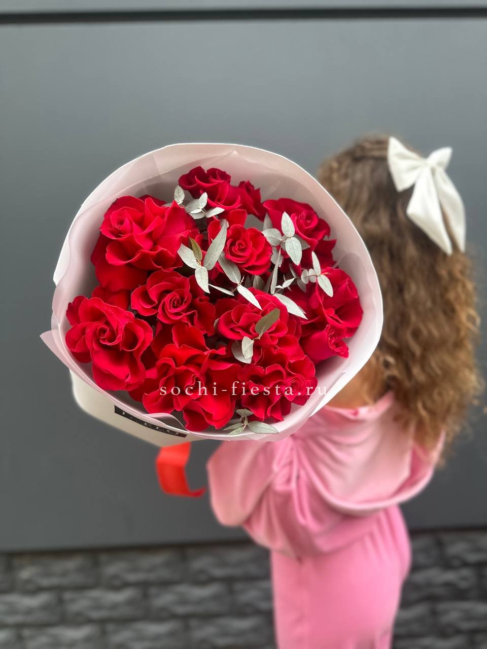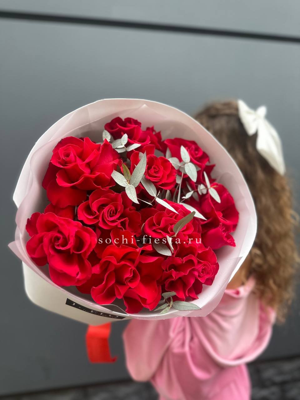 Пятнадцать вывернутых роз Джумилия раскрывают свою многослойную структуру в каждом бутоне. Эвкалипт обрамляет композицию, подчёркивая фактуру лепестков.