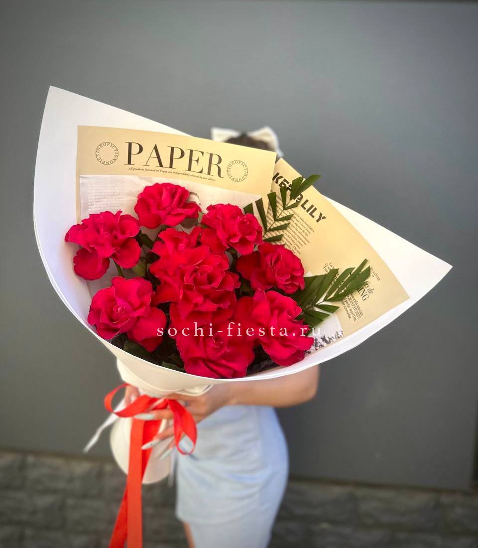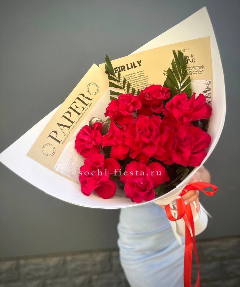 Вывернутые лепестки раскрывают внутреннюю структуру бутона и добавляют графичности всей композиции. Пятнадцать роз собраны в плотную группу с четким силуэтом.