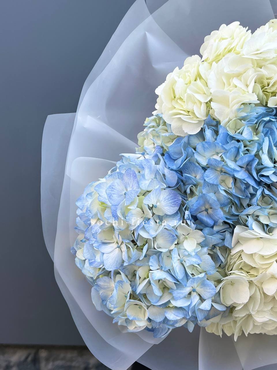 5 бело-голубых гортензий