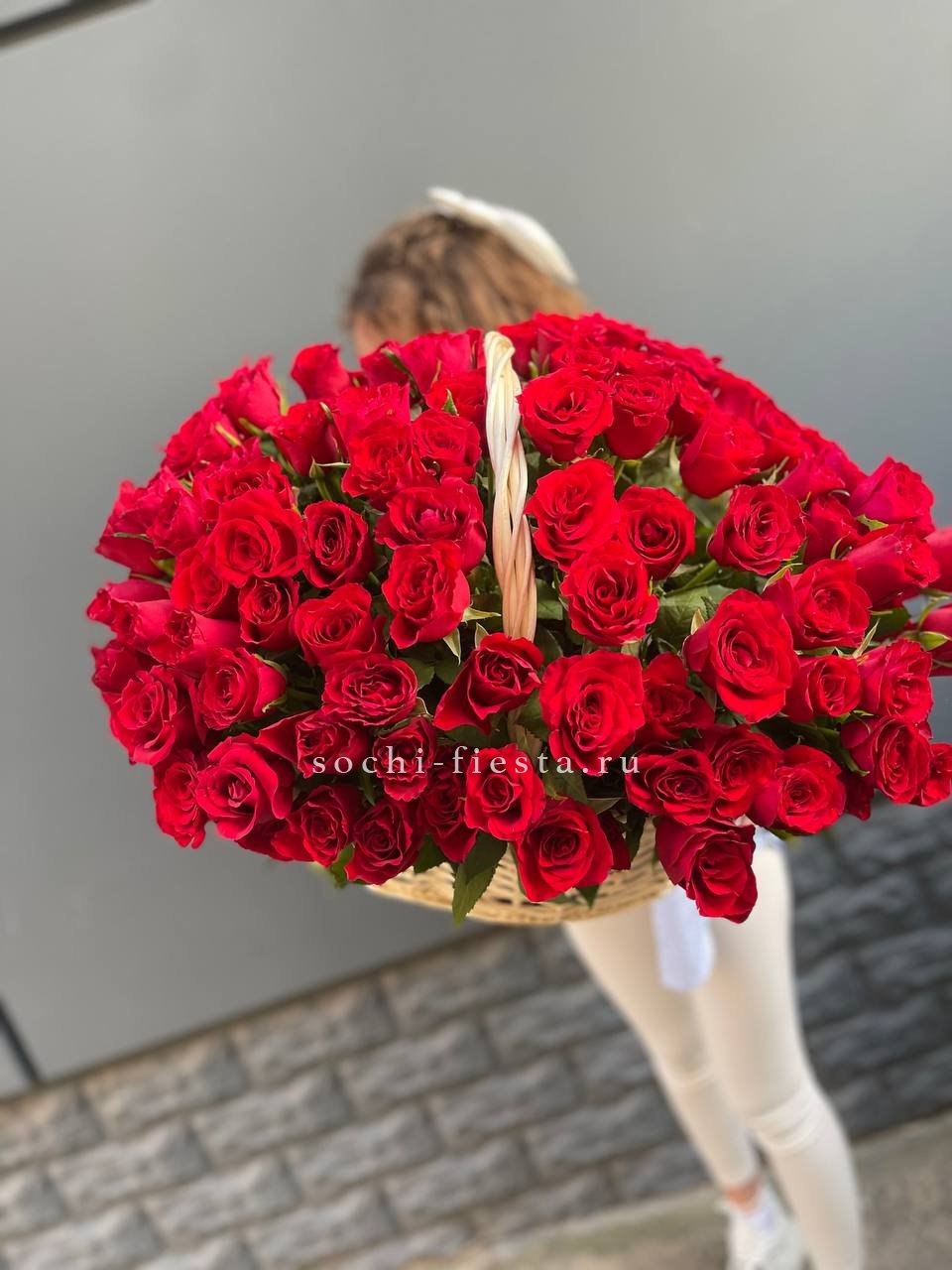 Пятьдесят один бутон в лаконичной упаковке из тишью и плёнки. Белые розы образуют плотный купол, где каждый цветок находит своё место в общей структуре букета.