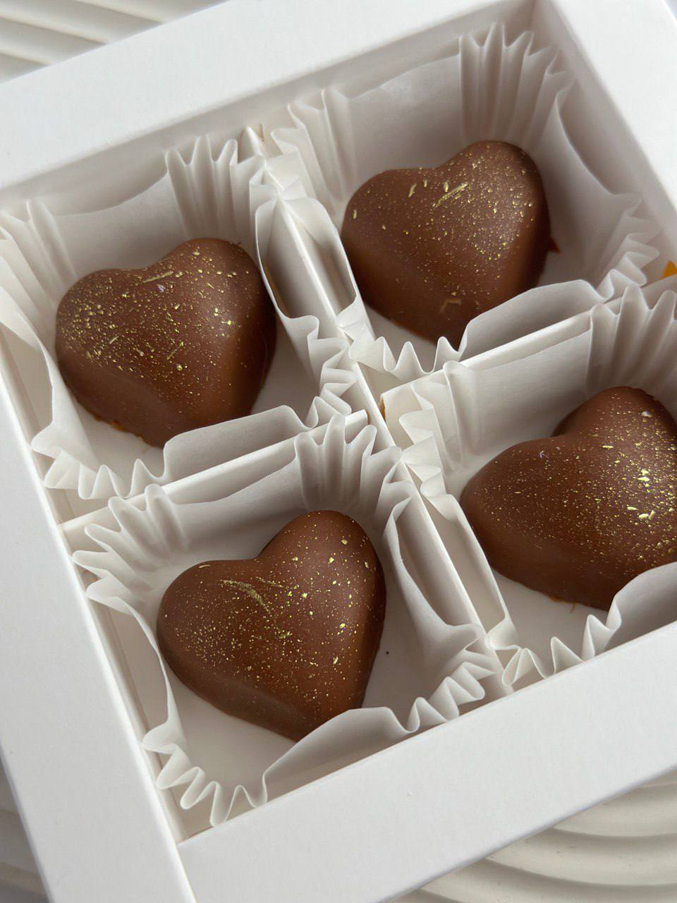 4 сердца из бельгийского шоколада. Есть две начинки- с орехом или Дубайским шоколадом (менеджер подскажет по наличию). Ручная роспись.
