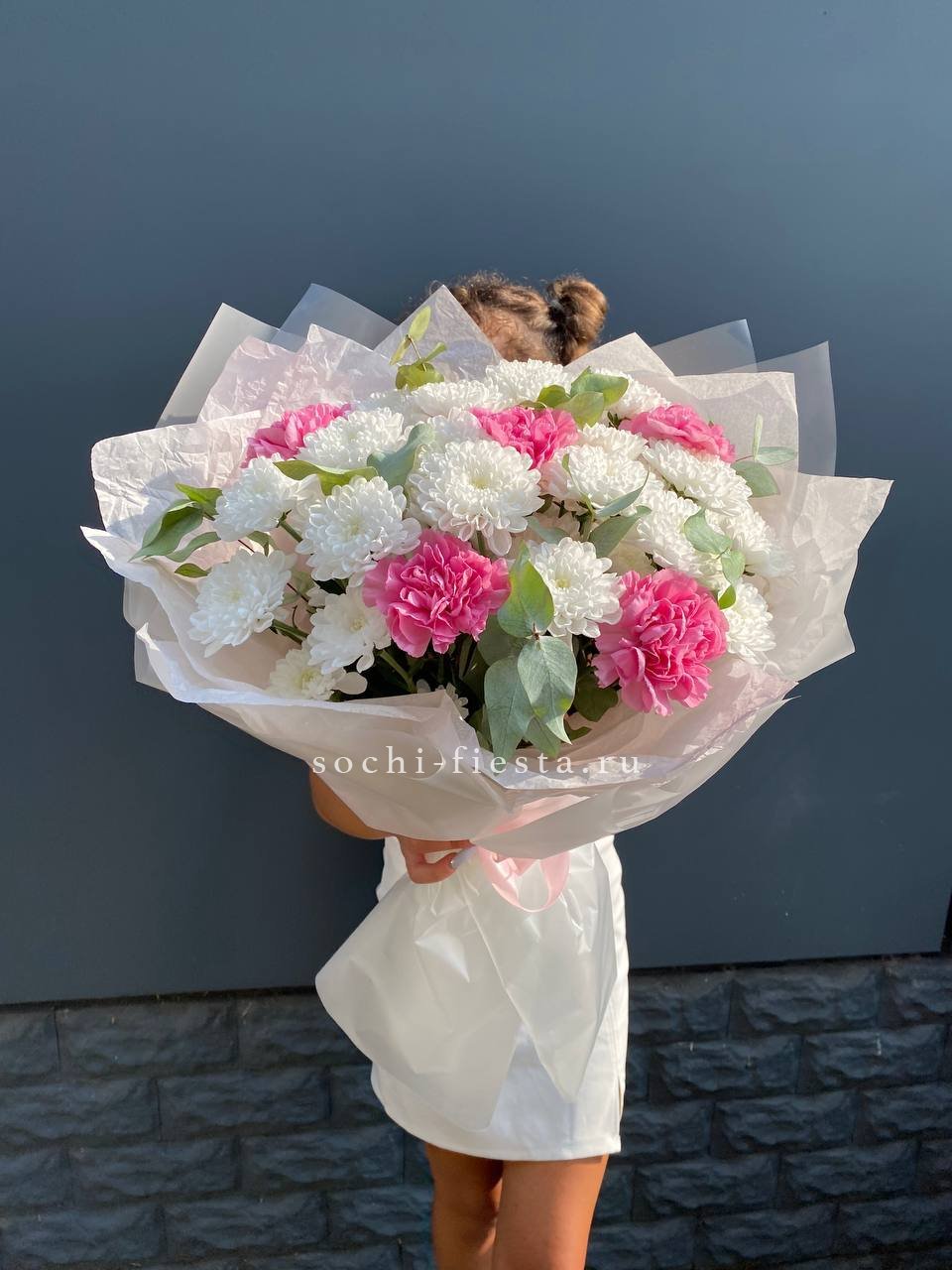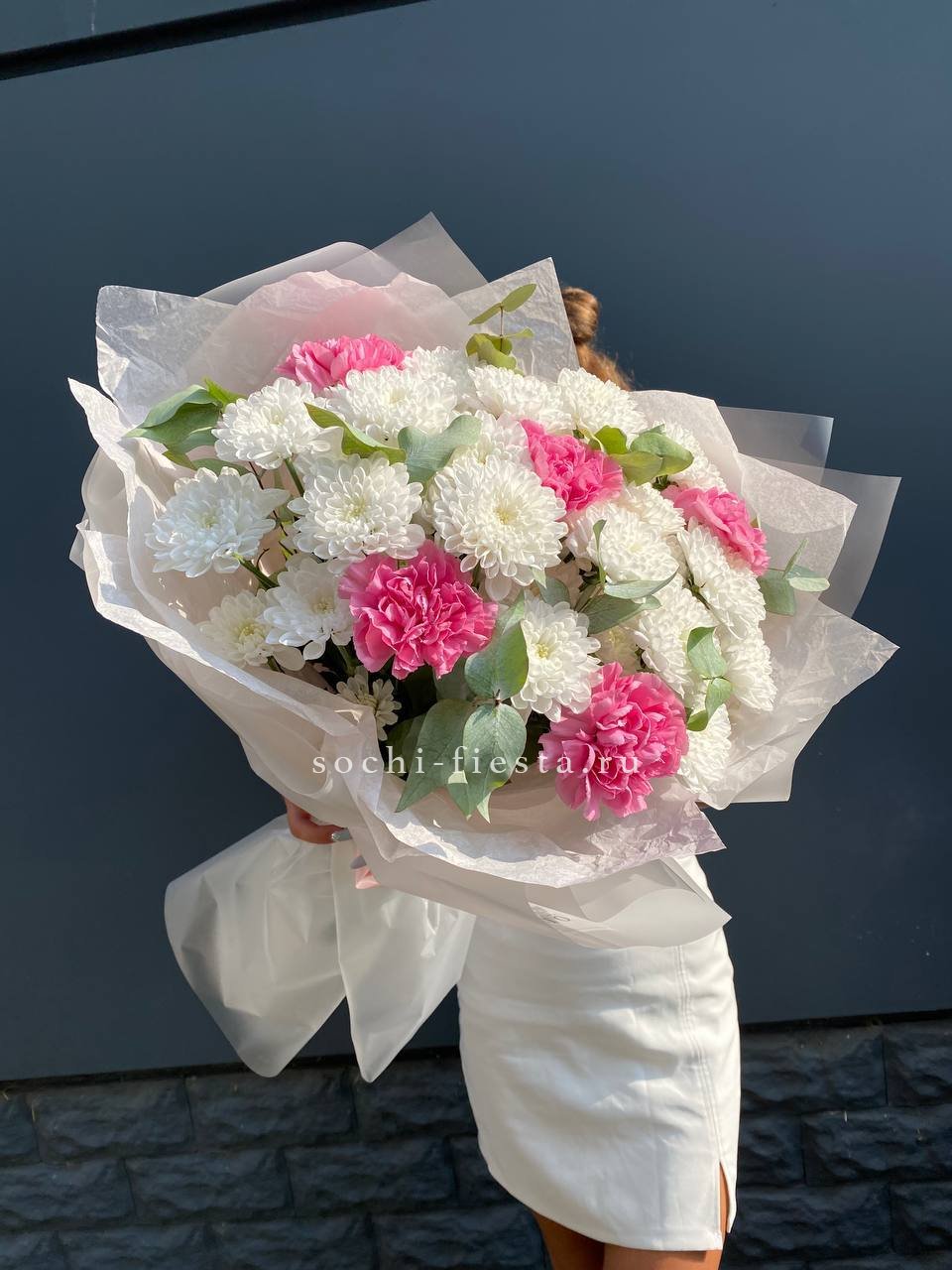 Одиннадцать вывернутых бутонов WhiteNice раскрываются волнами лепестков с матовым свечением. Эвкалипт добавляет воздуха между соцветиями.