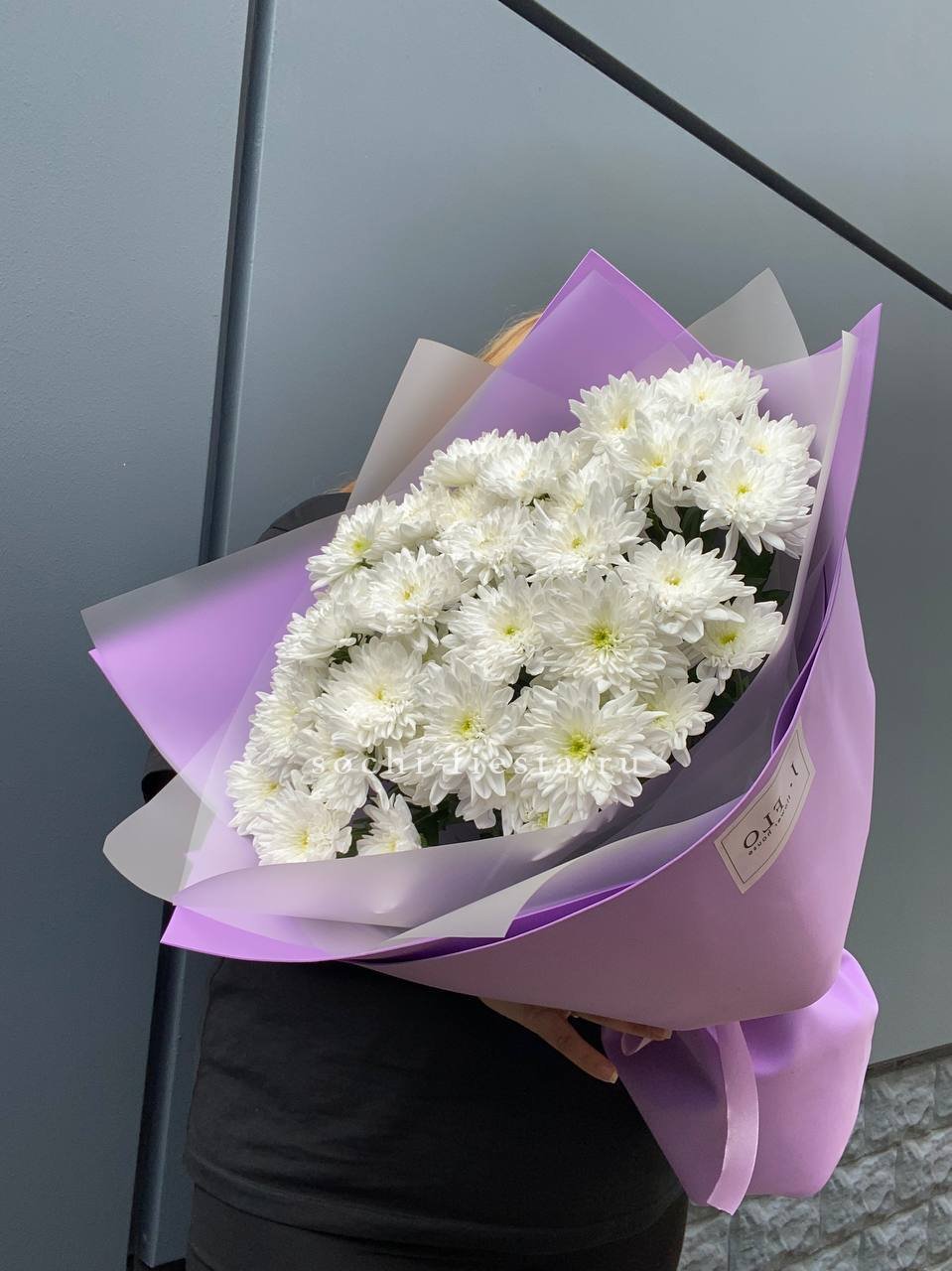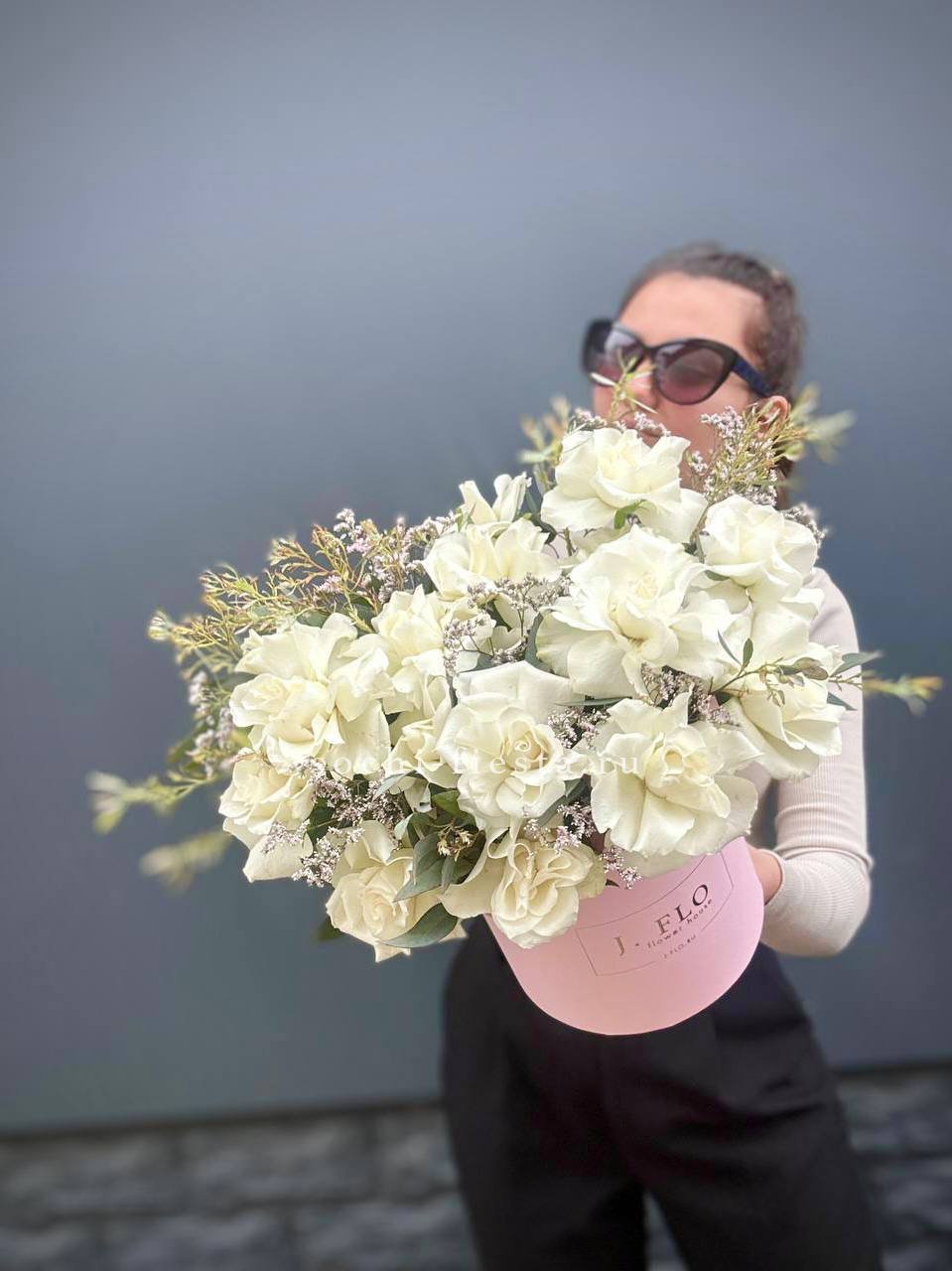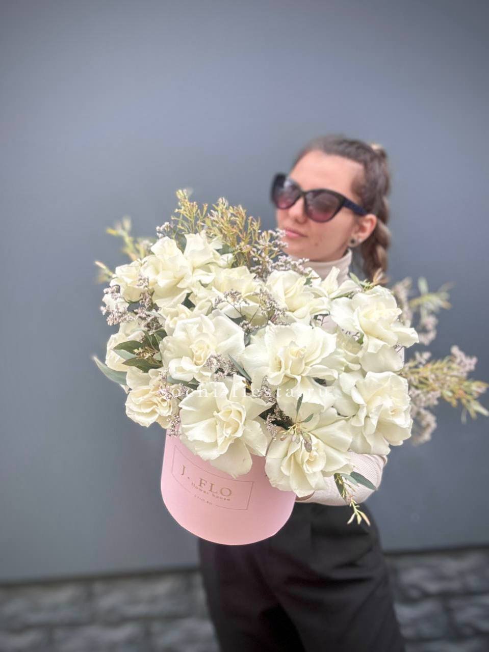 Одиннадцать белых бутонов собраны в компактную форму и обрамлены розовой бумагой. Чистый цвет и аккуратная сборка создают спокойное впечатление.
