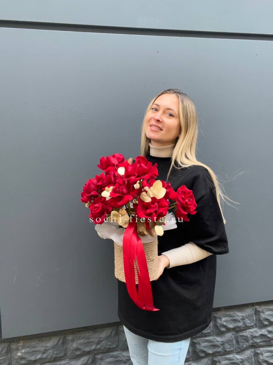 Девять красных тюльпанов в аккуратной связке. Яркие упругие бутоны на крепких стеблях держат форму и добавляют цвета в весенний день.