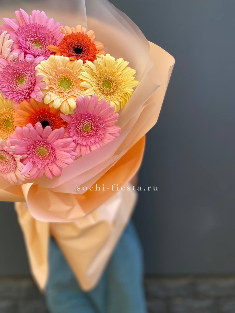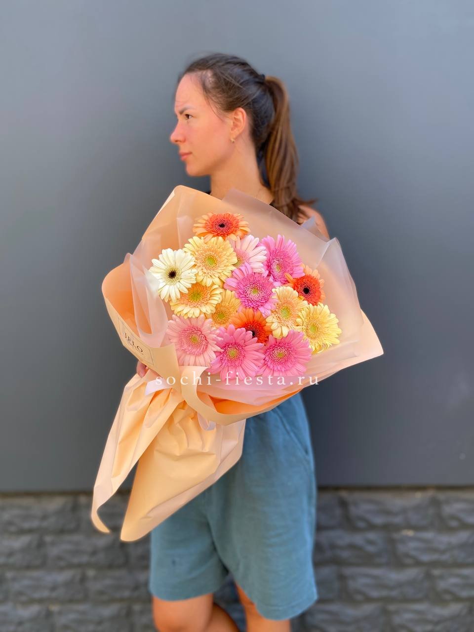 Пятнадцать гербер собраны в плотную округлую форму, где каждый цветок раскрыт навстречу свету. Яркая палитра создаёт ощущение летнего дня, застывшего в лепестках.