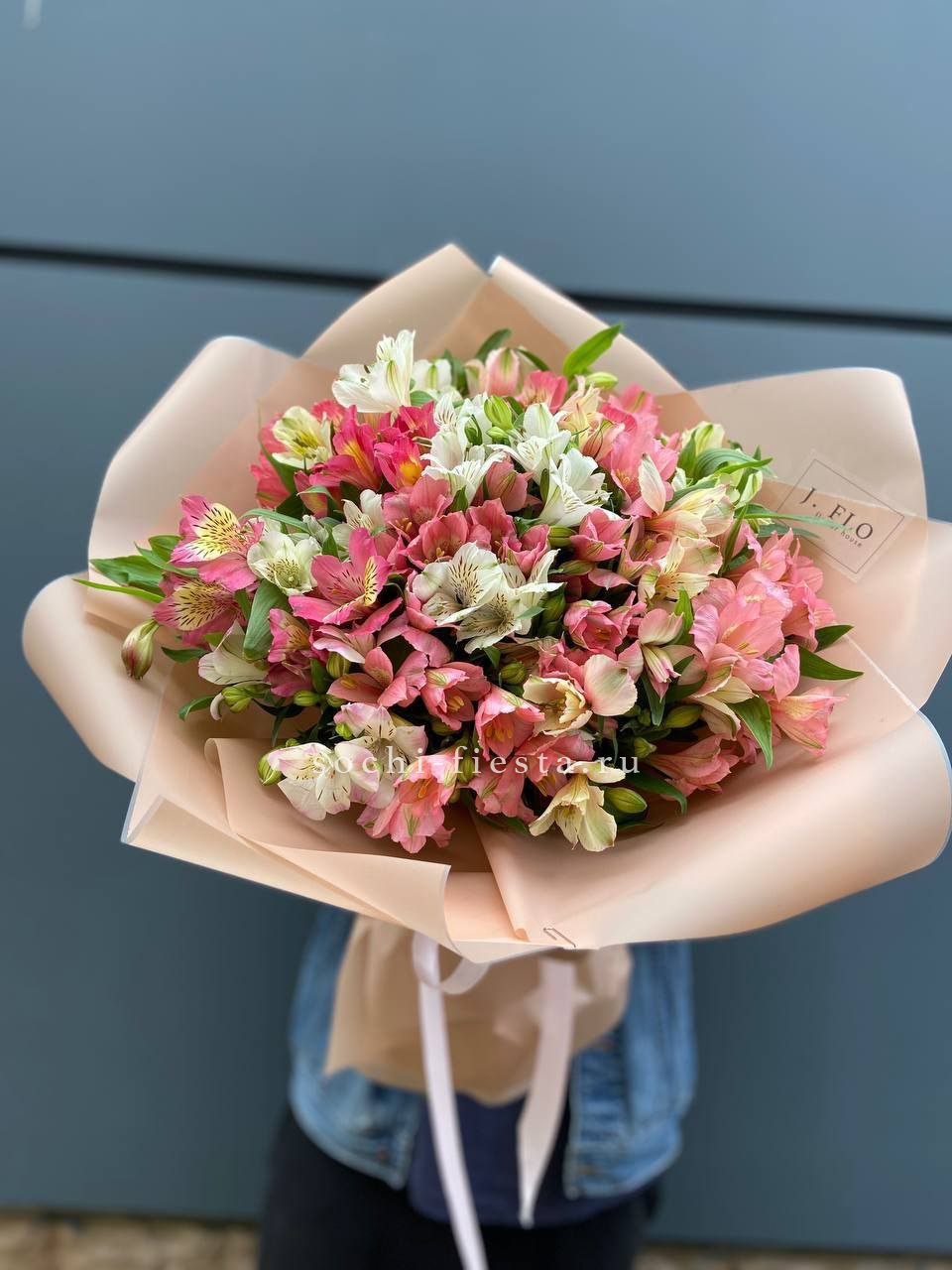 Пятьдесят одна ветка альстромерий складывается в объёмную шапку с насыщенным цветом и многослойной текстурой. Каждый бутон раскрывается постепенно, продлевая яркость букета на долгие дни.