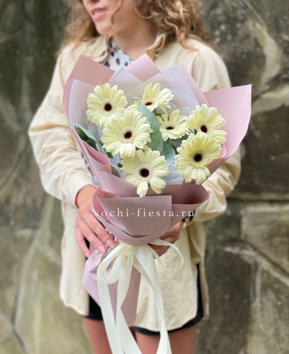 Девять гербер разных оттенков образуют компактный букет с чёткими линиями. Лаконичная упаковка позволяет каждому цветку звучать самостоятельно, создавая весёлую радужную композицию.