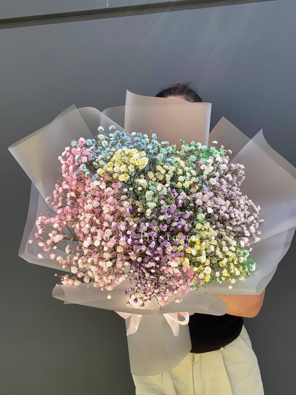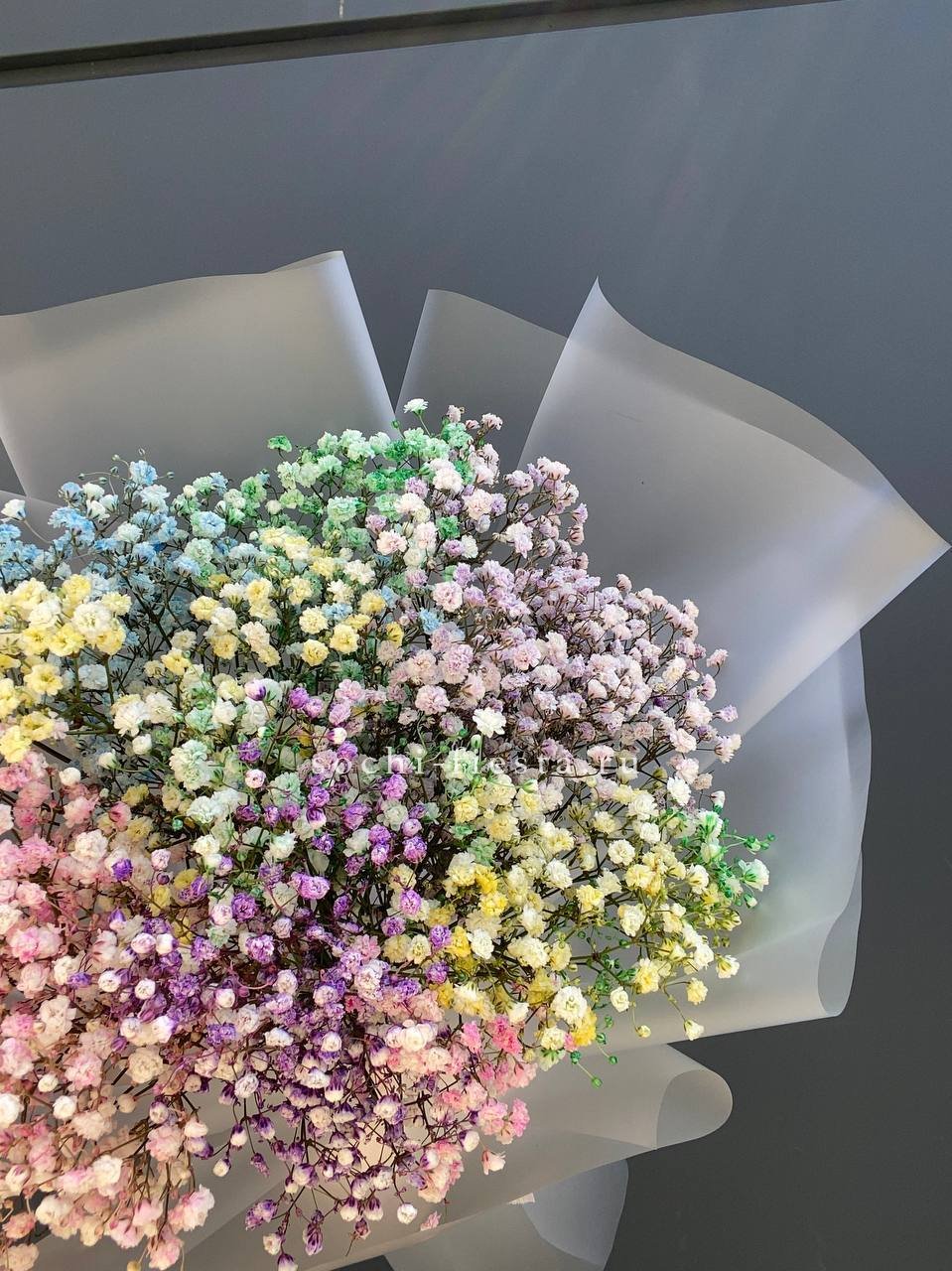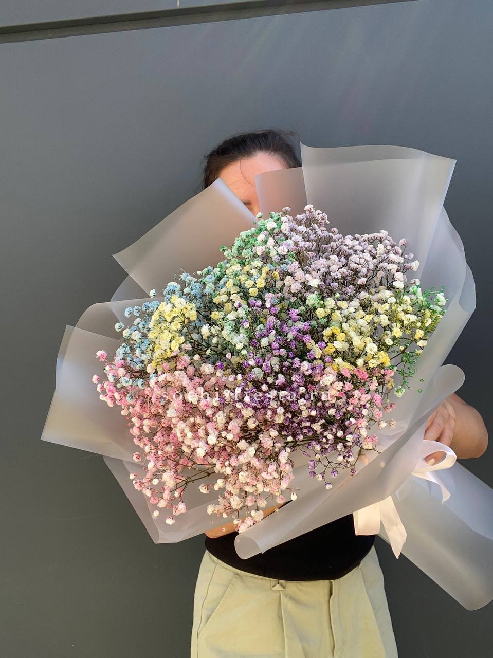 Семь веточек гипсофилы в радужной палитре собраны в компактную форму. Яркие переливы оттенков наполняют пространство живой энергией.