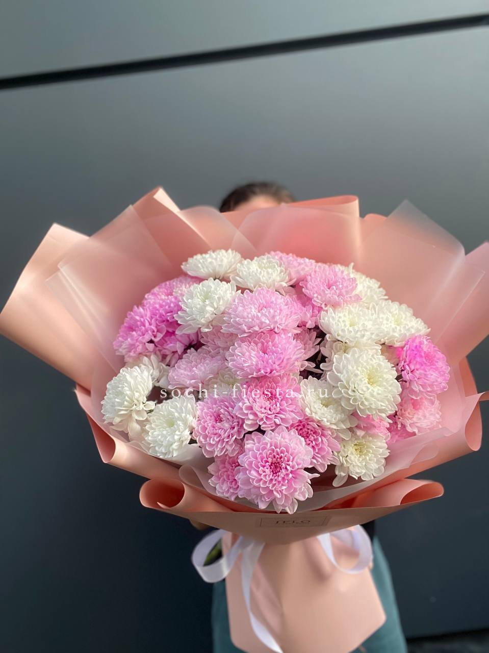 Бело-розовые кустовые хризантемы создают мягкий переход оттенков. Лепестки формируют воздушную структуру, где светлые тона перетекают в насыщенные. Композиция дышит и притягивает взгляд своей лёгкостью.