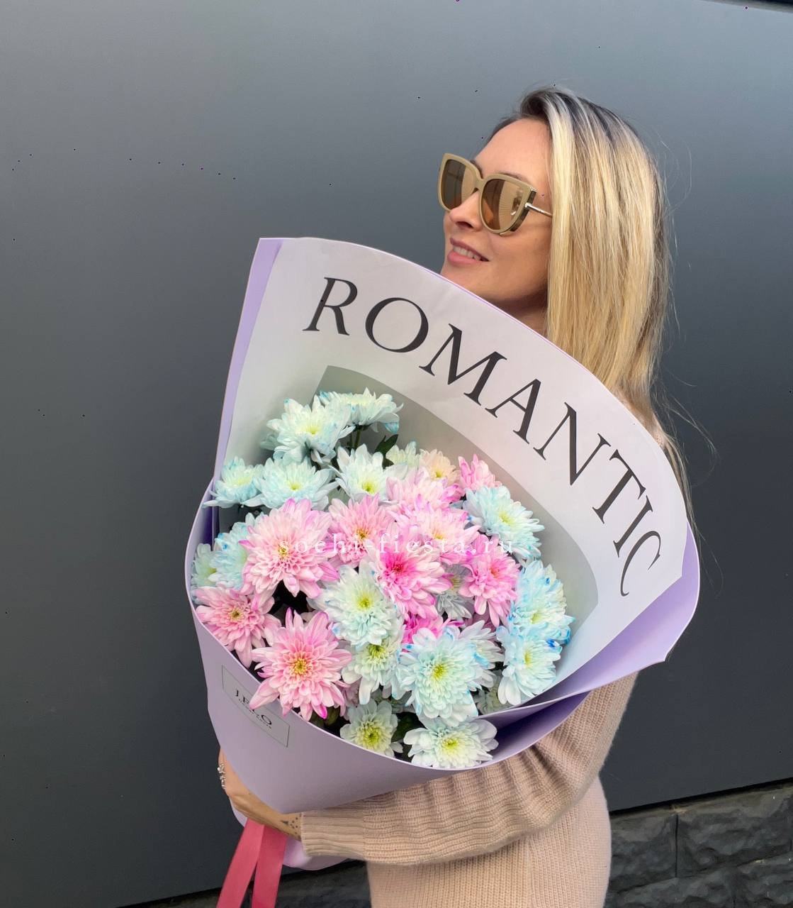 Девять веток кустовых хризантем раскрываются пышной шапкой мелких соцветий. Авторская упаковка добавляет графичности без лишних деталей. Букет держит форму и радует долгим цветением.