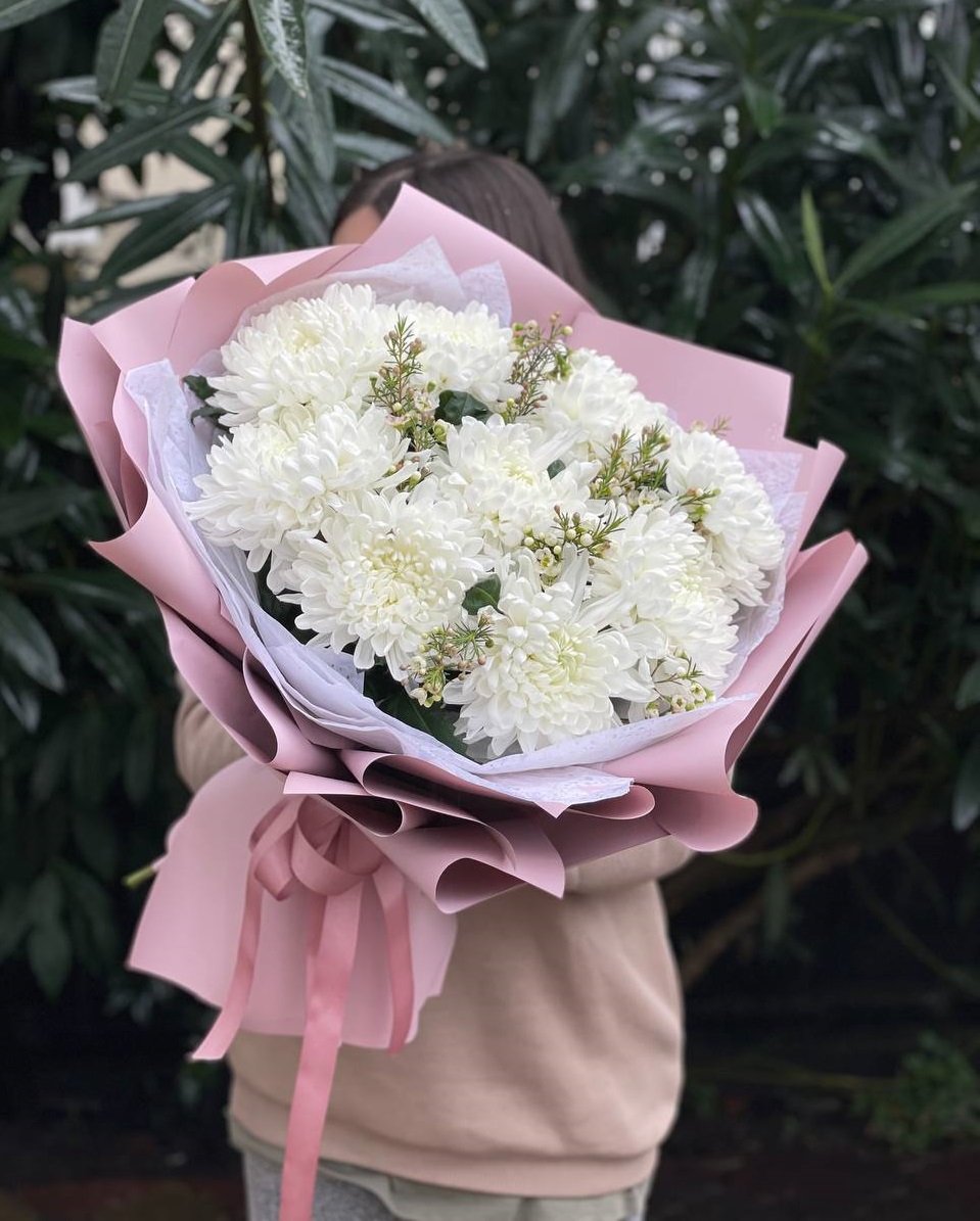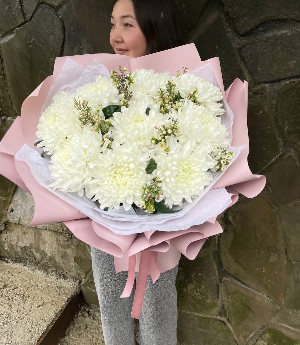 Тридцать девять белоснежных хризантем образуют плотное облако с чёткими графичными линиями. Крупные соцветия создают объёмную структуру, которая держит форму и привлекает внимание своей архитектурой.