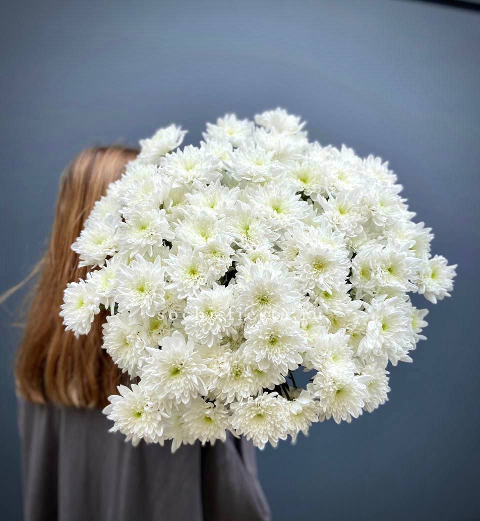 Двадцать одна ветка кустовой хризантемы в естественной подаче без лишнего декора. Простая форма и свежесть соцветий делают композицию универсальной для любого интерьера.