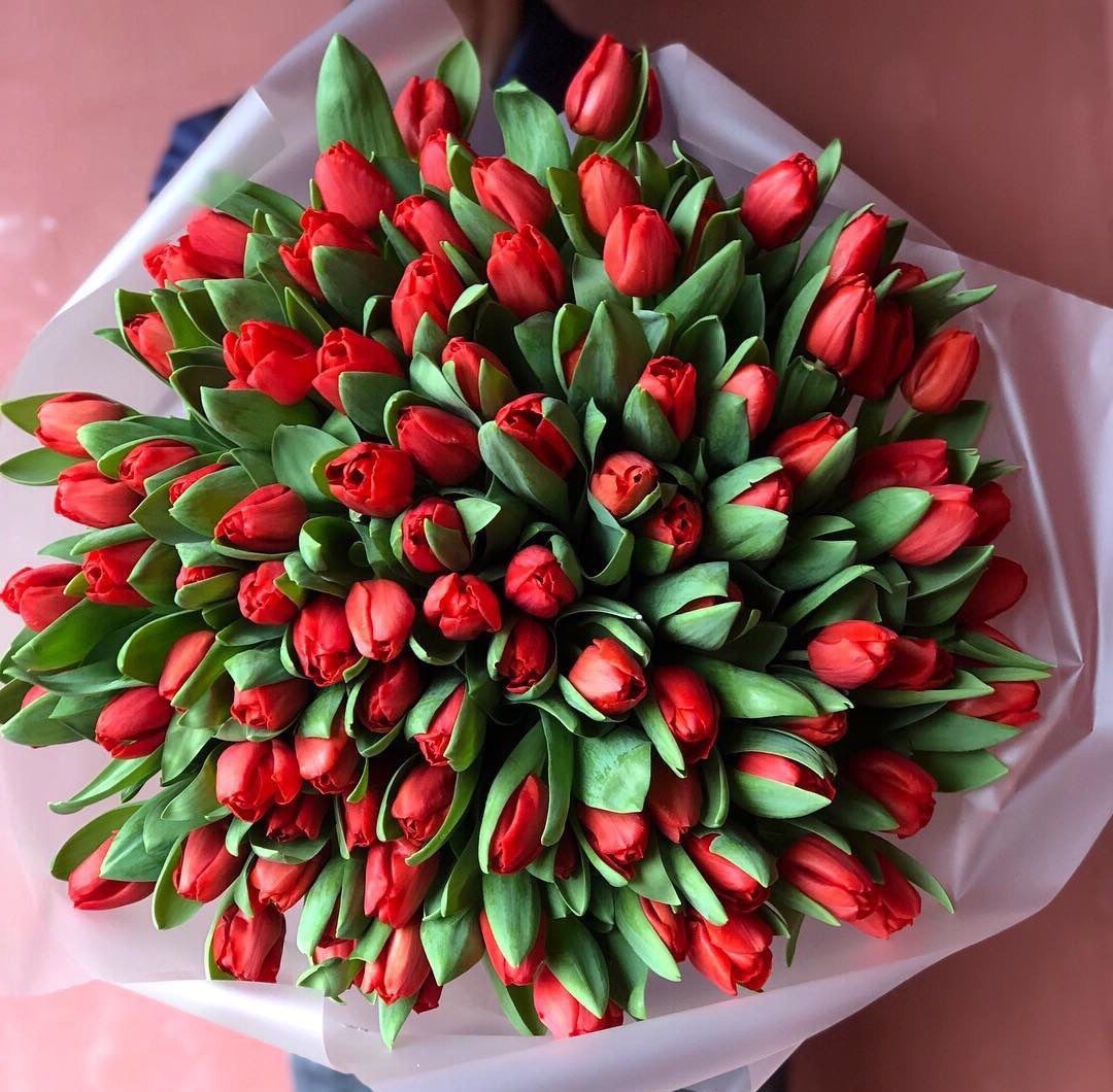 Пятнадцать бутонов собраны в плотную группу и упакованы в прозрачную пленку. Красный оттенок лепестков создает яркое цветовое пятно, которое сразу привлекает внимание. Тюльпаны сохраняют свежесть долго и не требуют сложного ухода.