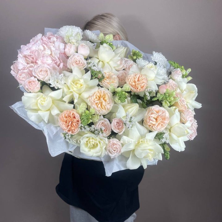 - Редкий состав — David Austin, ранункулюс, анемоны, уральские пионы в сезон.