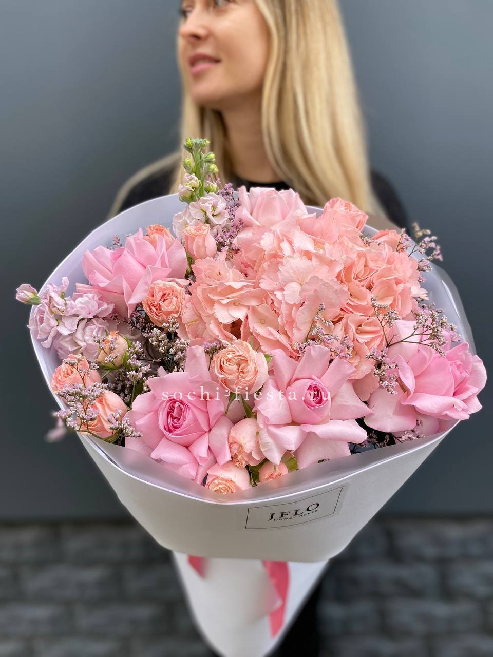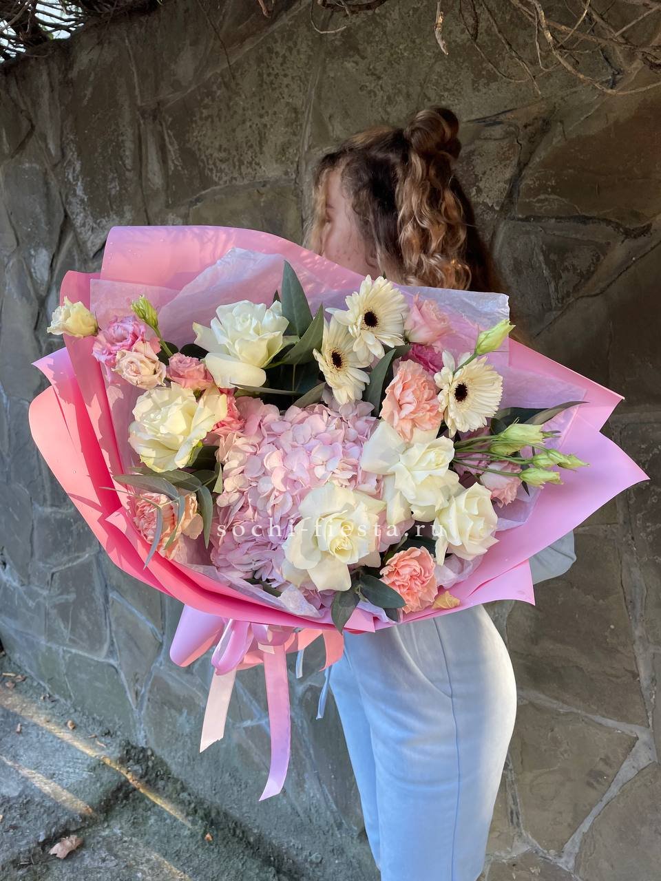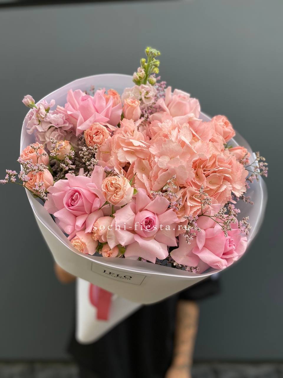 Пышные шапки гортензии переплетаются с бархатными бутонами пионовидных роз, создавая объёмную композицию насыщенного розового оттенка. Орхидеи и эустома добавляют воздушности, а диантус расставляет яркие точки. Букет заполняет пространство и притягивает взгляд своей плотной структурой.