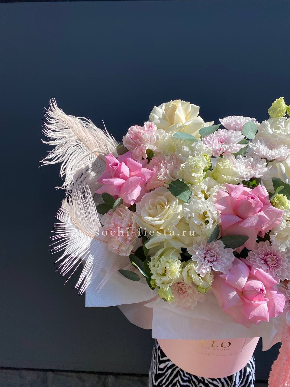 Перья и амарантус добавляют композиции воздушности и движения между французскими розами и хризантемами. Эустома и диантусы смягчают силуэт и создают многослойную фактуру в высоком боксе.