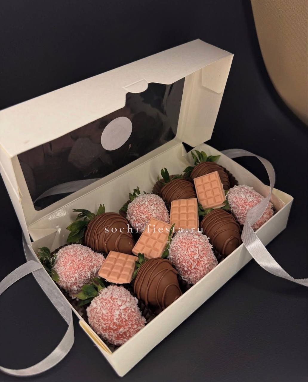 банан в бельгийском шоколаде. Данный товар можно заказать только с букетом, цветочной композицией, шарами или подарочной корзиной. Внутри каждого кусочка- спелый банан, а снаружи- гладкое, тающее во рту покрытие из премиального бельгийского шоколада. В наборе представлены вариации из молочного и белого шоколада. Для изготовления используются только свежие отборные бананы и высококачественный шоколад, что гарантирует великолепный вкус и аромат.