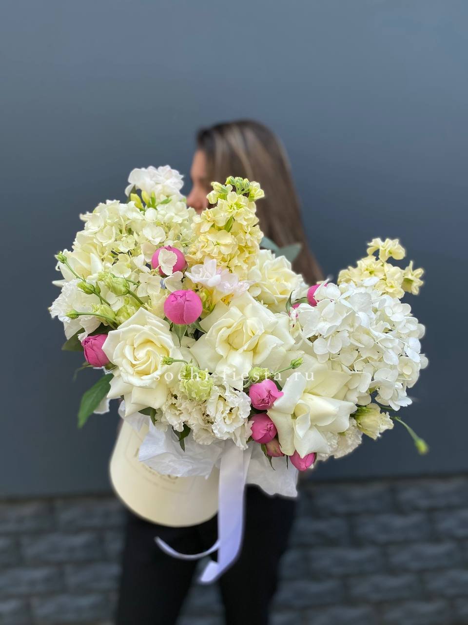 Эта роскошная композиция в модной сумочке объединяет благородные цветы с разными текстурами, создавая многогранный и богатый образ. Деликатные оттенки символизируют утонченность, элегантность и безупречный вкус. Сумочка подчеркнет индивидуальность дарителя и станет незабываемым акцентом любого торжества.