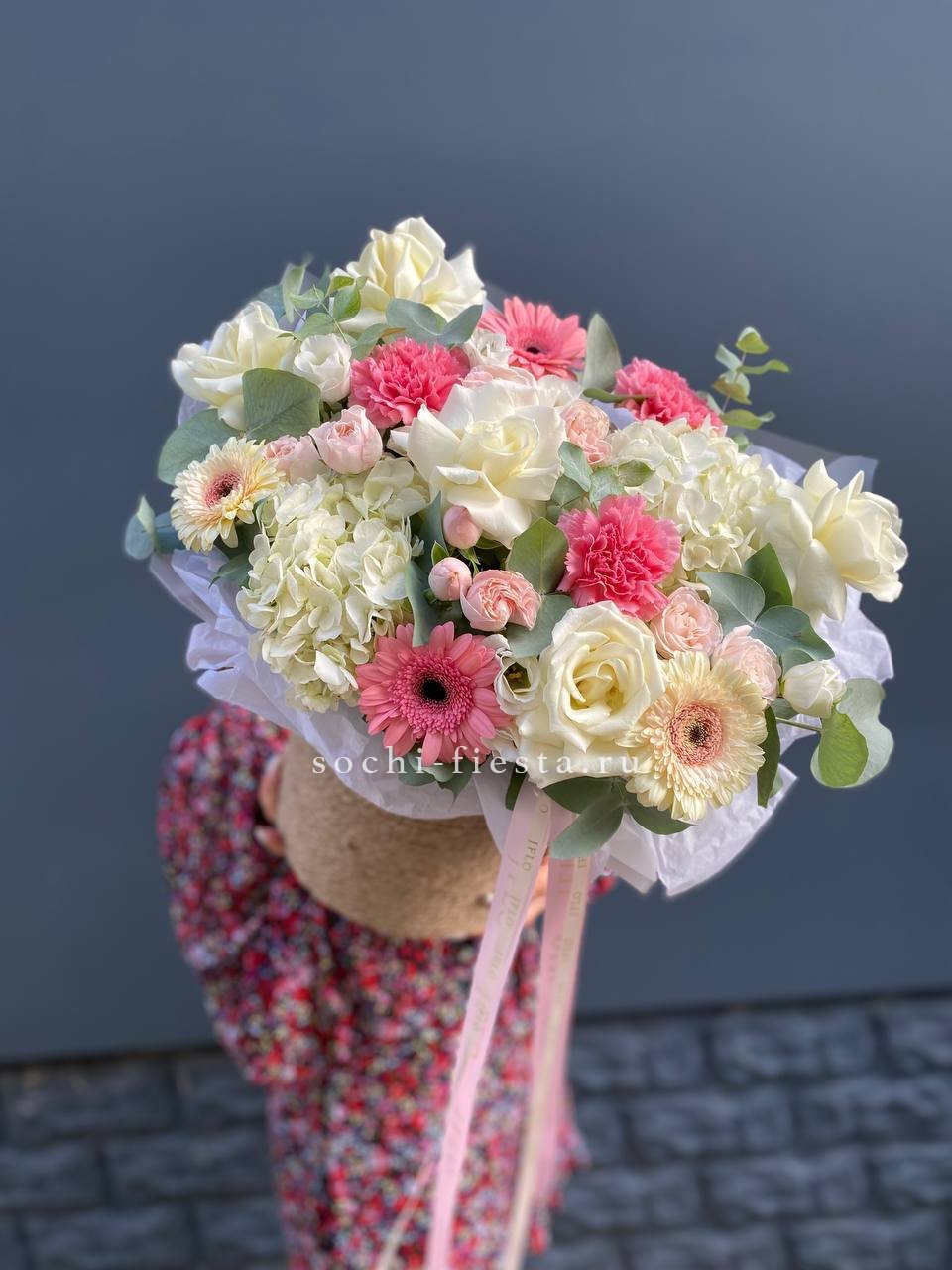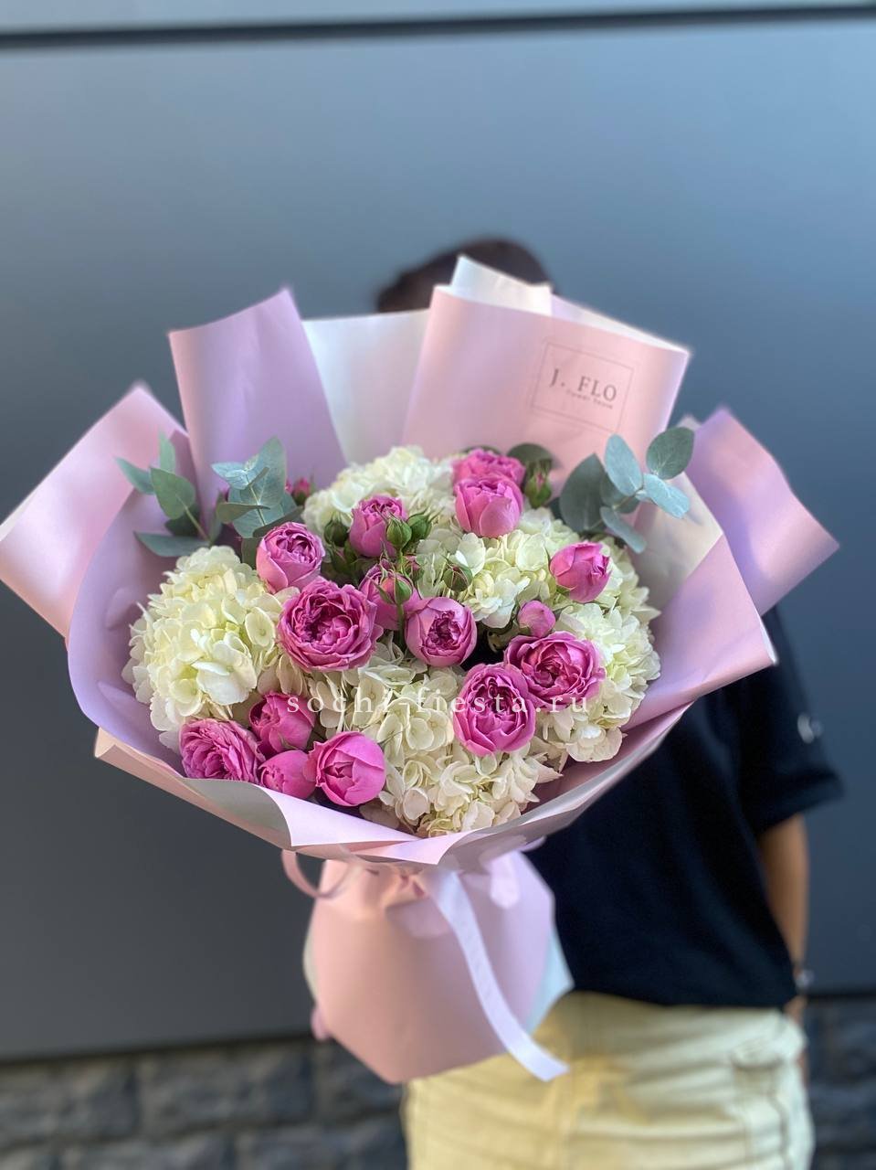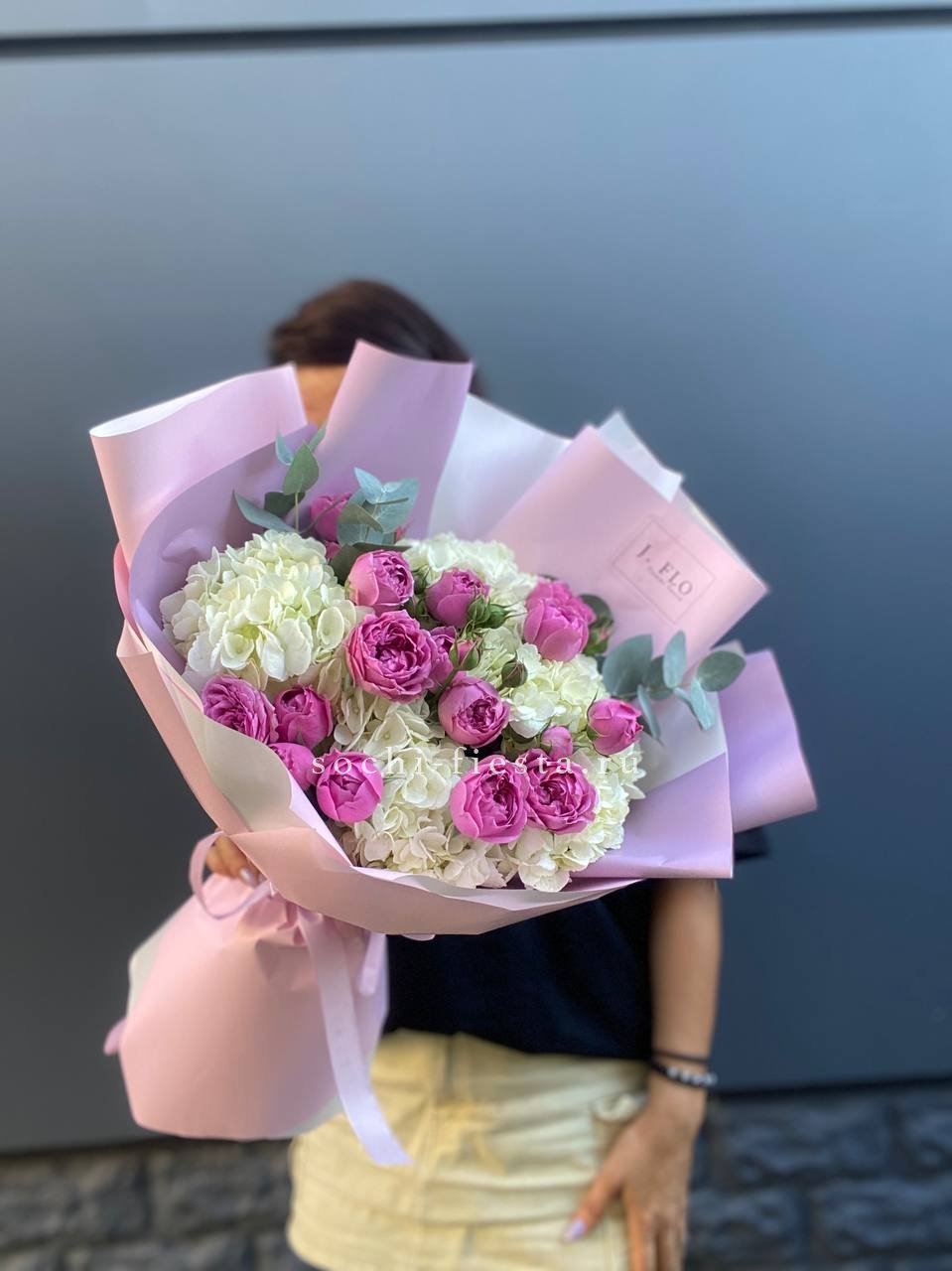 Пионовидные розы соседствуют с классическими, создавая игру объёмов и плотности бутонов. Диантус вплетается между ними легкими штрихами. Эвкалипт добавляет воздуха и завершает силуэт.