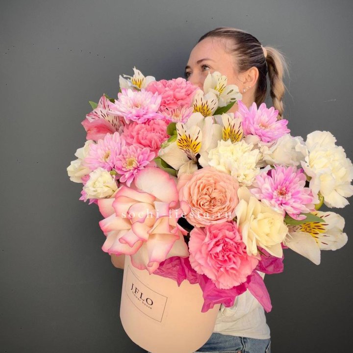Наполнение подбирается под сезон и аудиторию. Зимой — амариллис, розы Red Naomi, ранункулюсы. Весной — тюльпаны и ранункулюсы. Летом — пионы в мае-июне, гортензия в июле-августе. Осенью — хризантемы и декоративные травы.