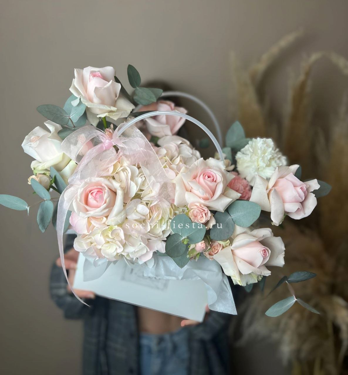 гортензия, розы, эустома, эвкалипт, диантус, лента, сумка.