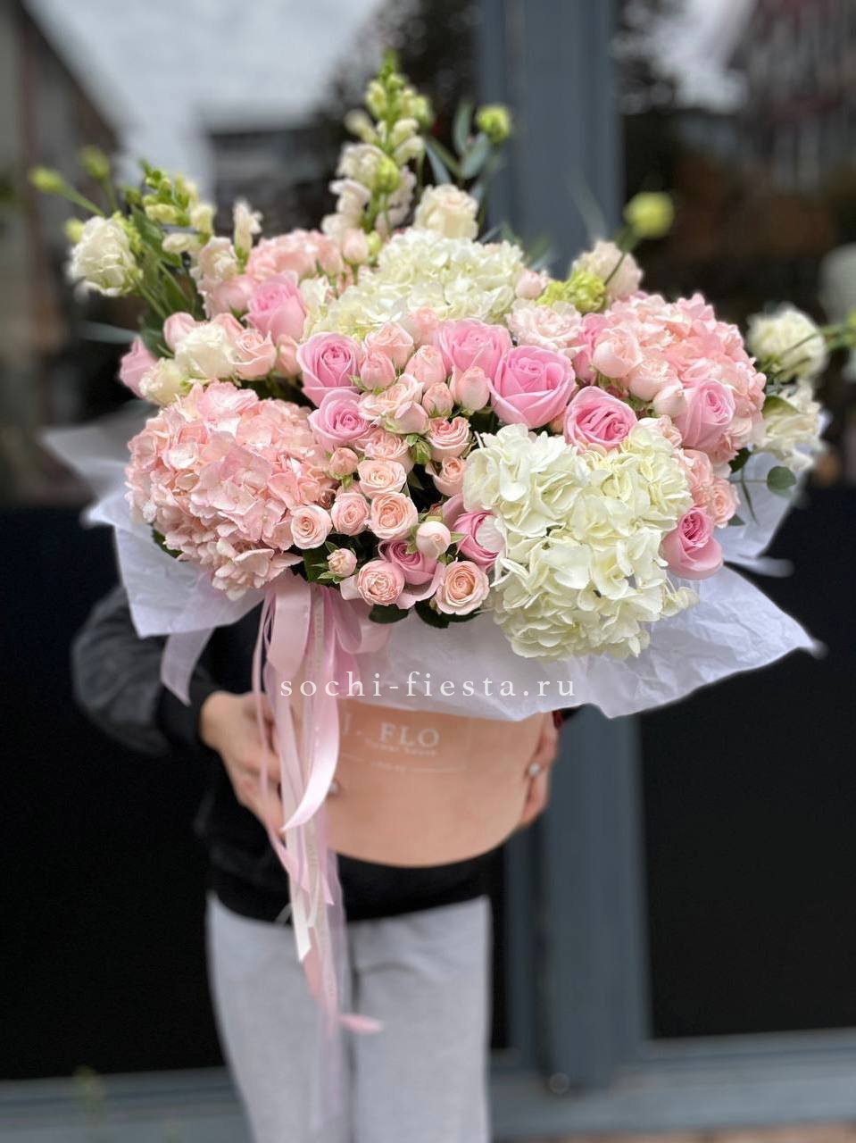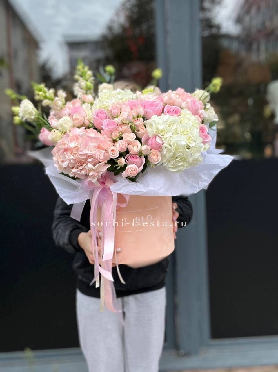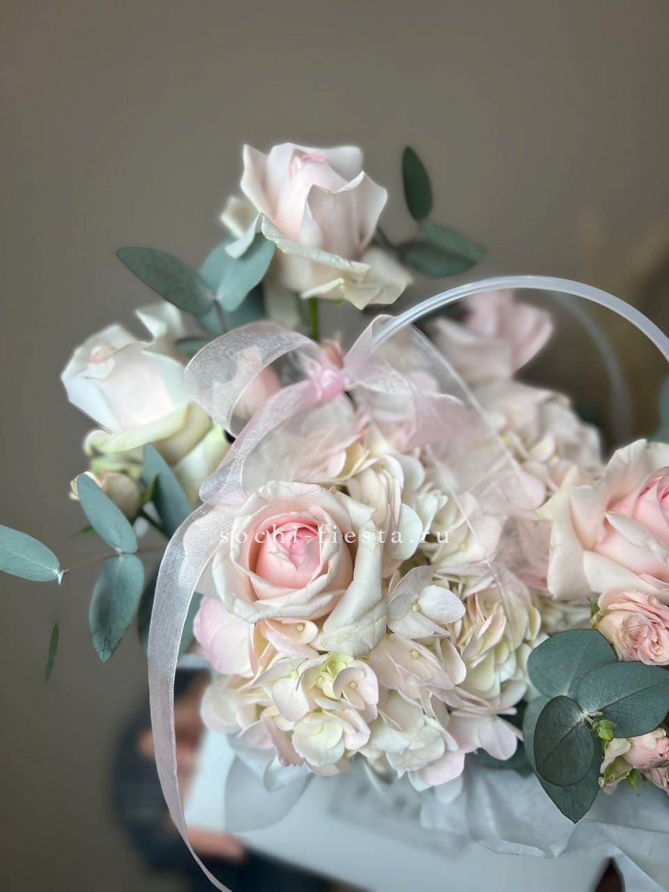 Гортензия заполняет пространство пышными соцветиями, розы и эустома расставляют акценты. Диантус и эвкалипт дополняют картину зеленью и мелкими деталями. Компактная форма удобна для размещения.
