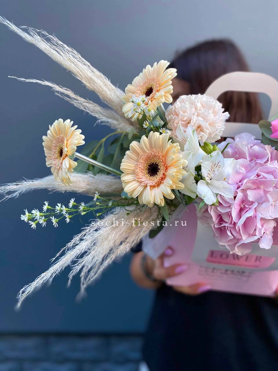 джумилия, гербера, мисти баблс, диантус, хлопок, лагурус, сумочка.