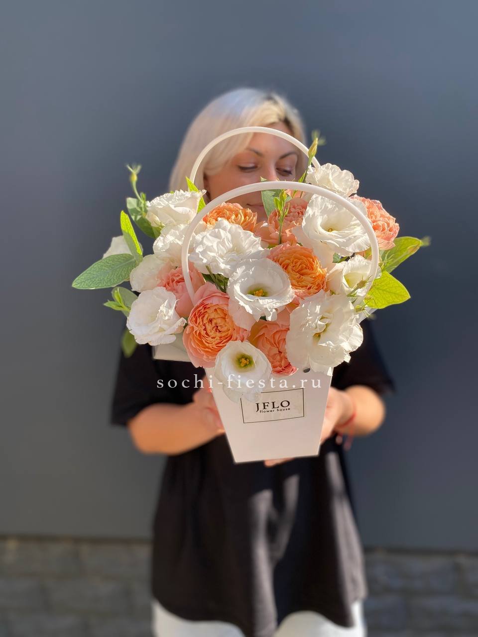 Пионовидные розы раскрываются пышными шапками рядом с воздушными соцветиями эустомы. Компактная форма сумочки удобна для вручения и не требует поиска вазы.