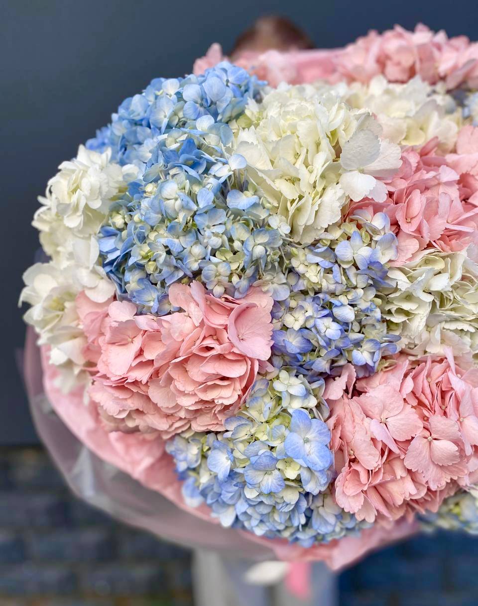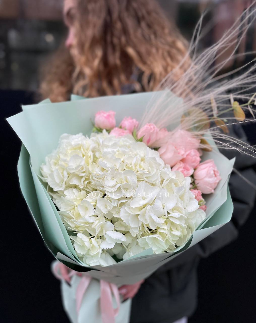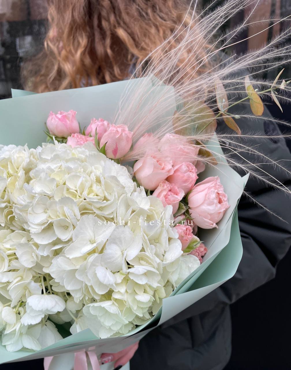 Пышная гортензия задает объем, эустома и диантус заполняют пространство между крупными бутонами. Статица добавляет графичность, а розы бомбастик завершают композицию.