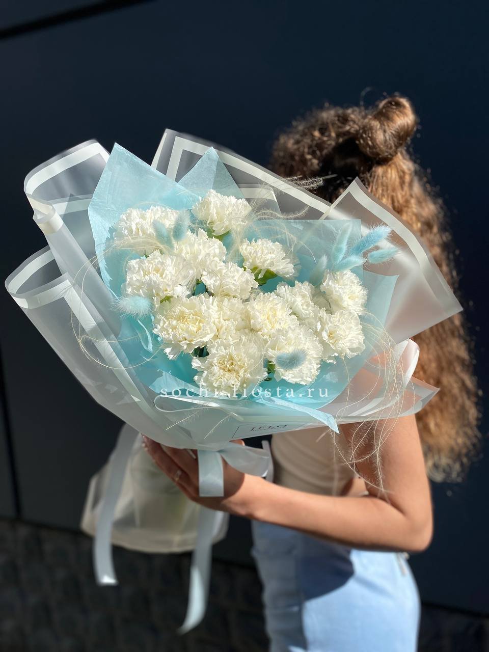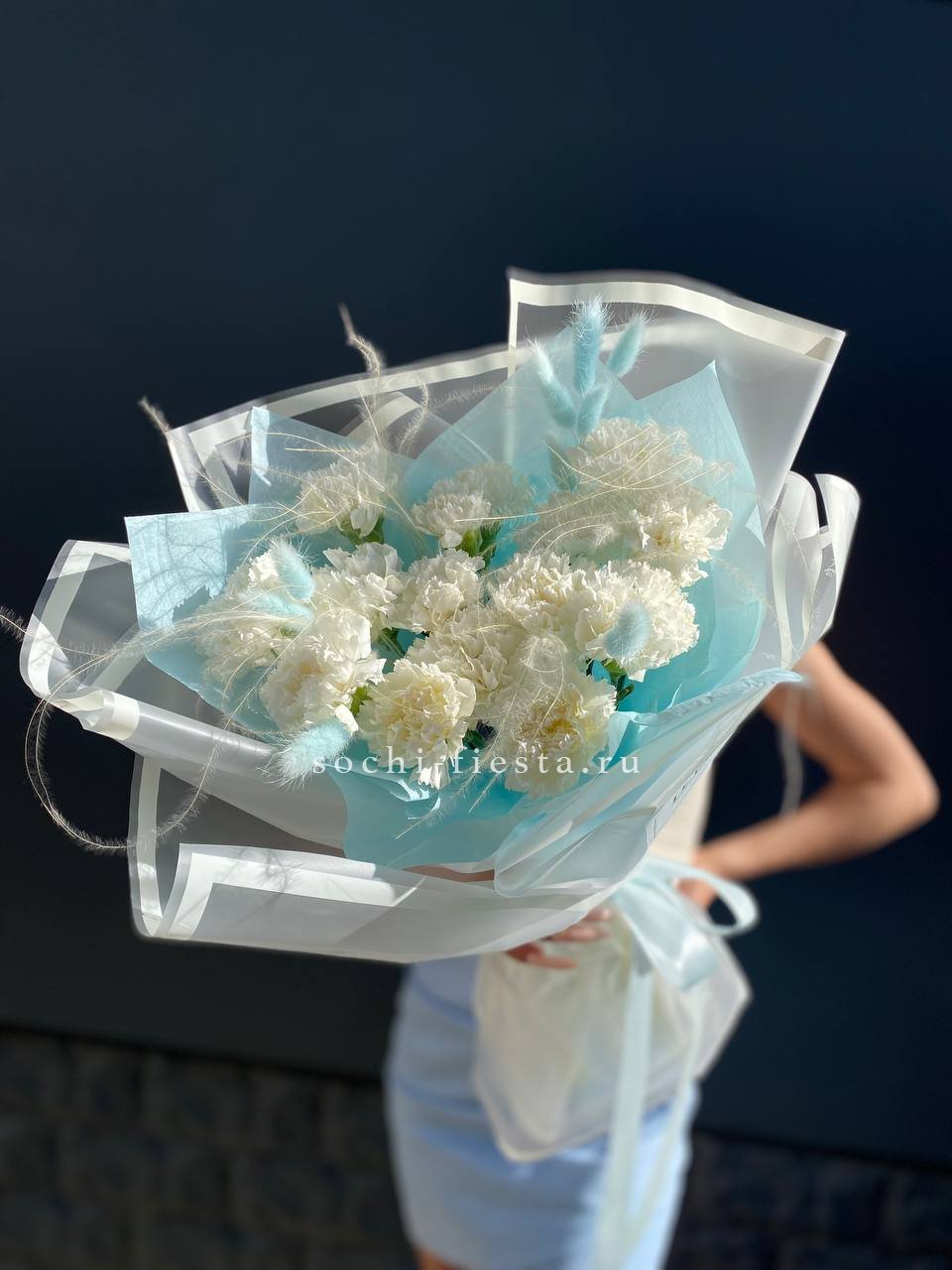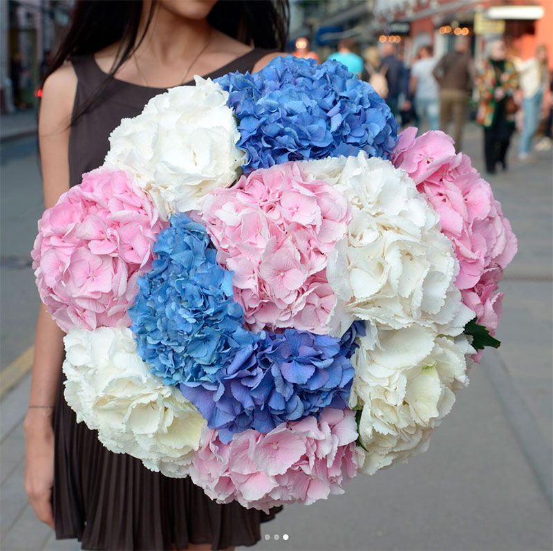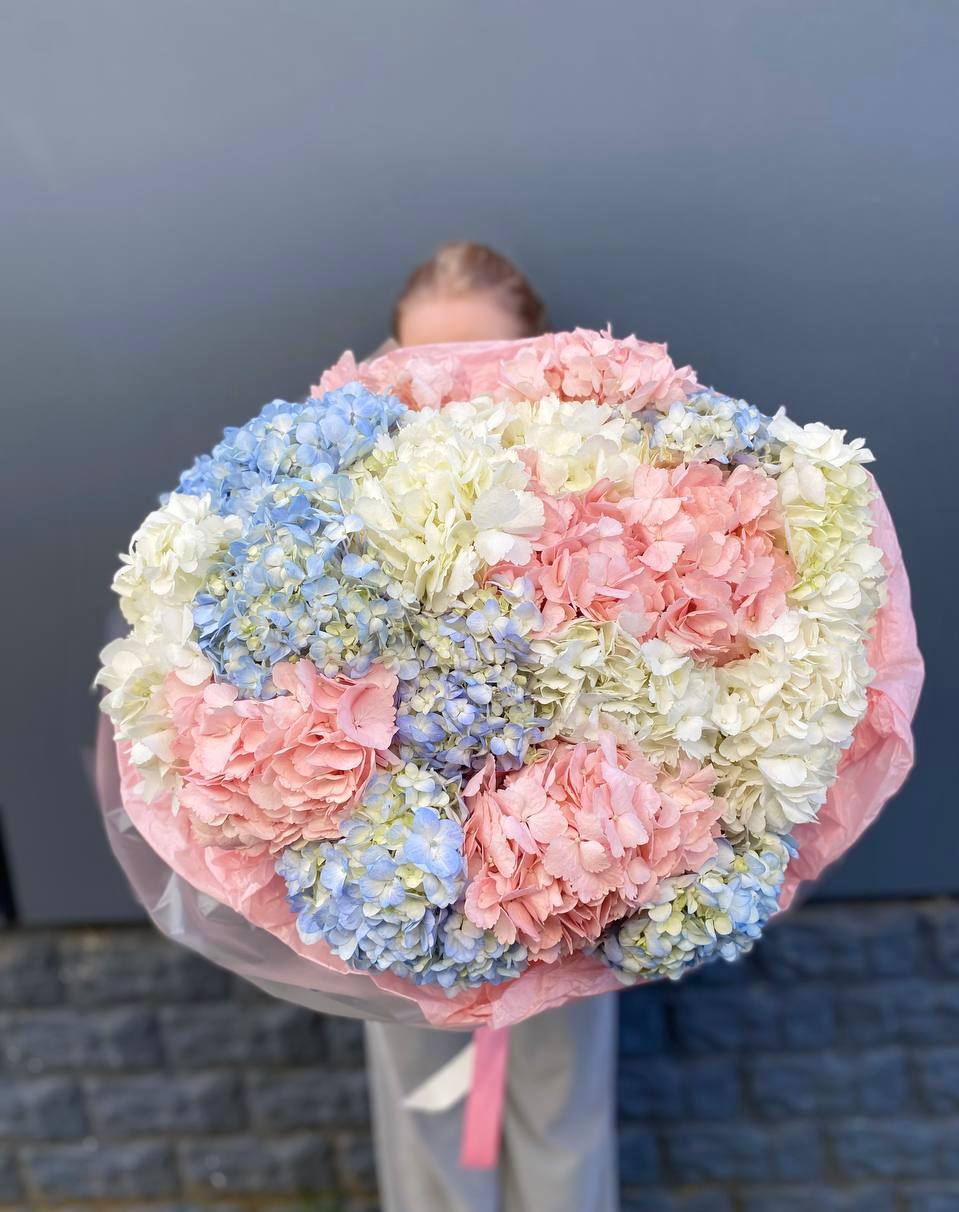 Пышная гортензия задает объем, эустома и диантус заполняют пространство между крупными бутонами. Статица добавляет графичность, а розы бомбастик завершают композицию.