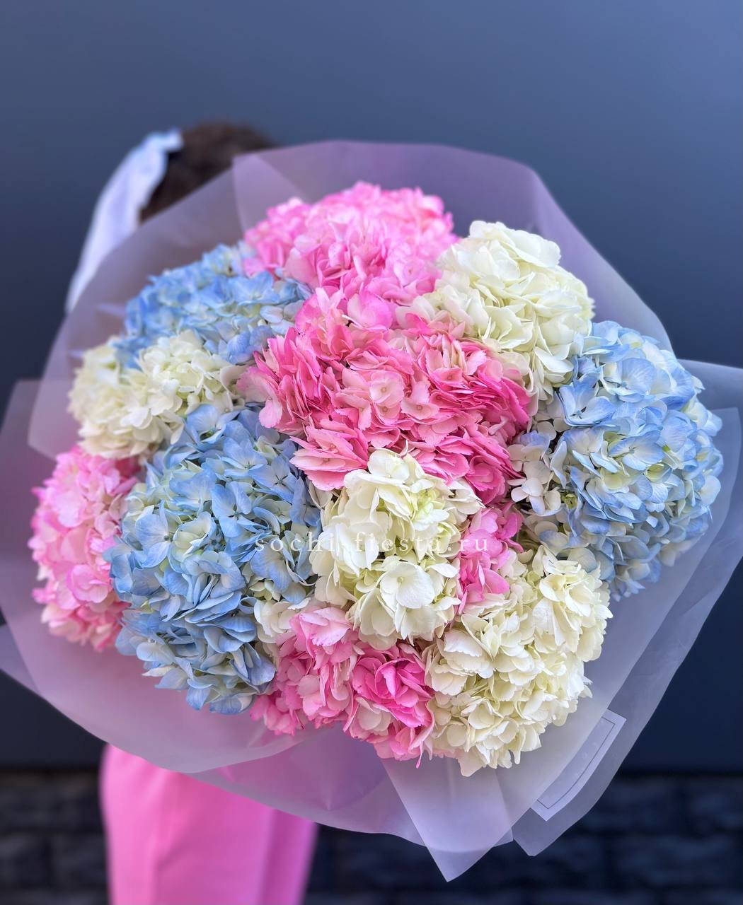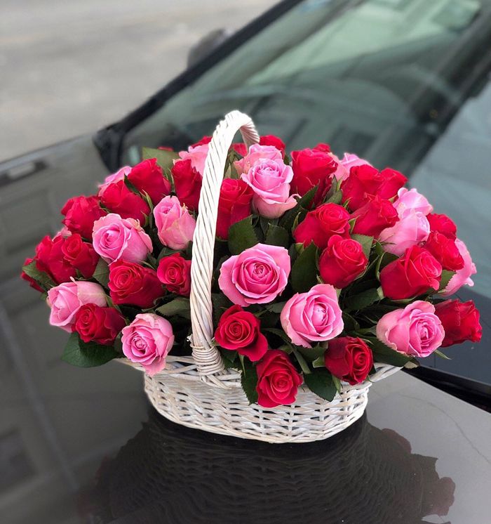 Пышная корзина с розами и гортензиями собрана плотно и объёмно. Маттиола добавляет живую текстуру между крупными соцветиями, а кустовые розы заполняют композицию мягкими переходами. Результат — впечатляющее присутствие, которое меняет восприятие пространства.