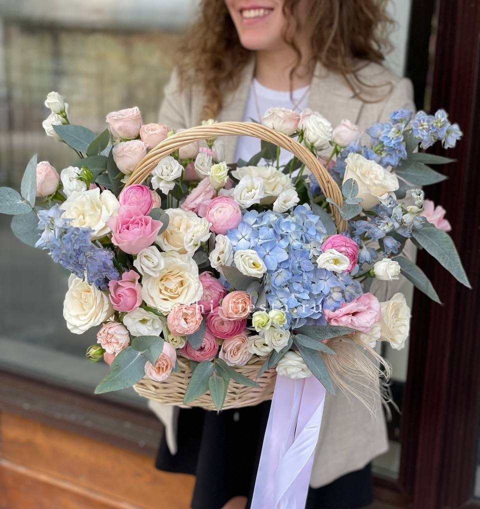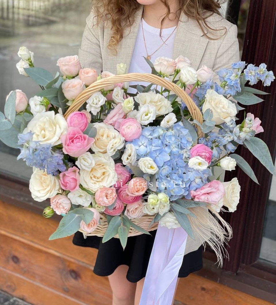 маттиола, гортензии, кустовые розы, розовые розы в корзине.