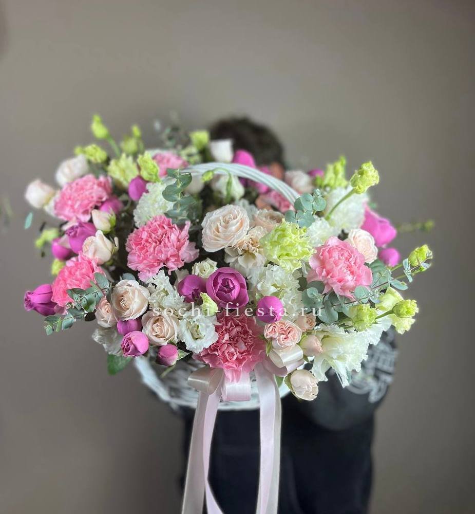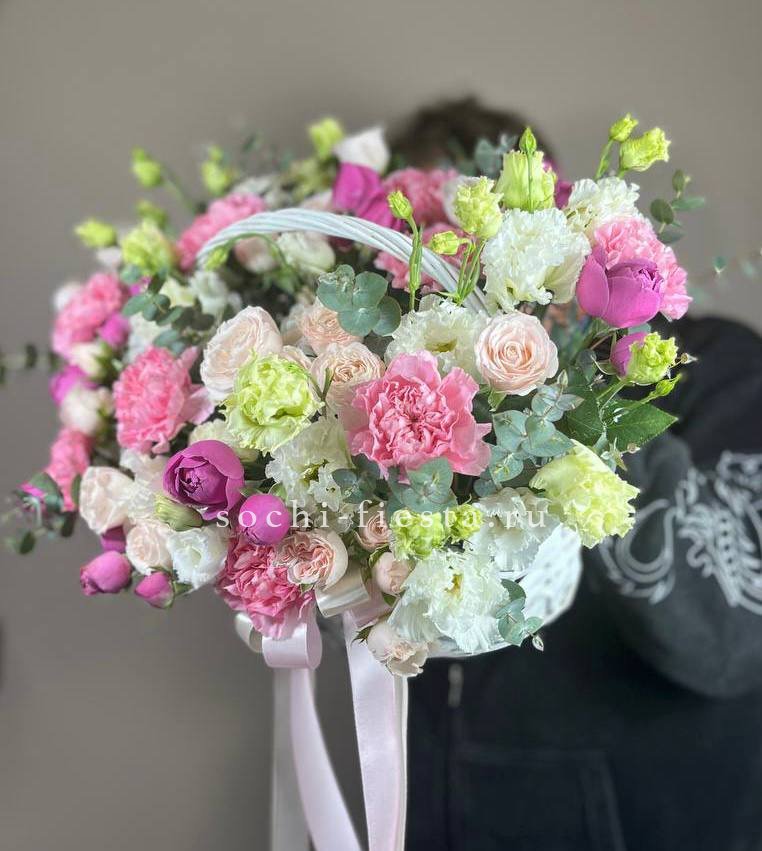 Пышная корзина объединяет пионовидные розы с воздушной гортензией и многослойной эустомой. Матиолла и лимониум добавляют глубину композиции, а диантус создает мягкие переходы между крупными бутонами.