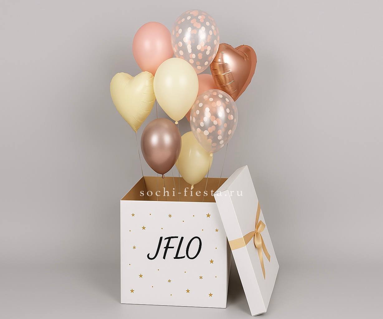 коробка с цветами разноцветного градиента (гортензии, розы, герберы, диантусы, кустовые розы, альстромерии, хризантемы, антирринум, озотамус).