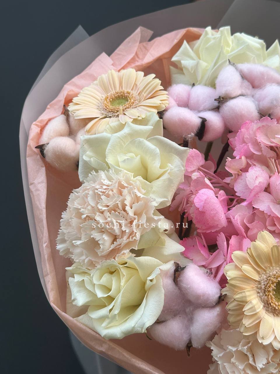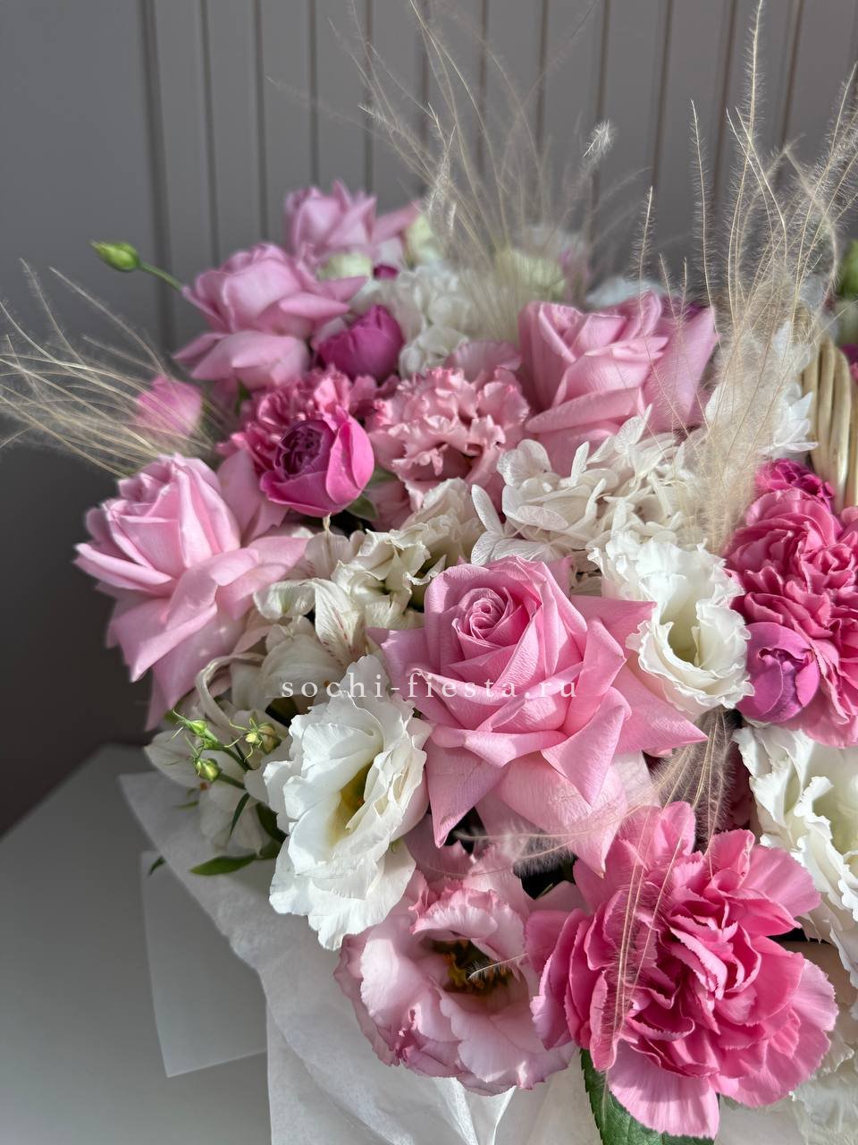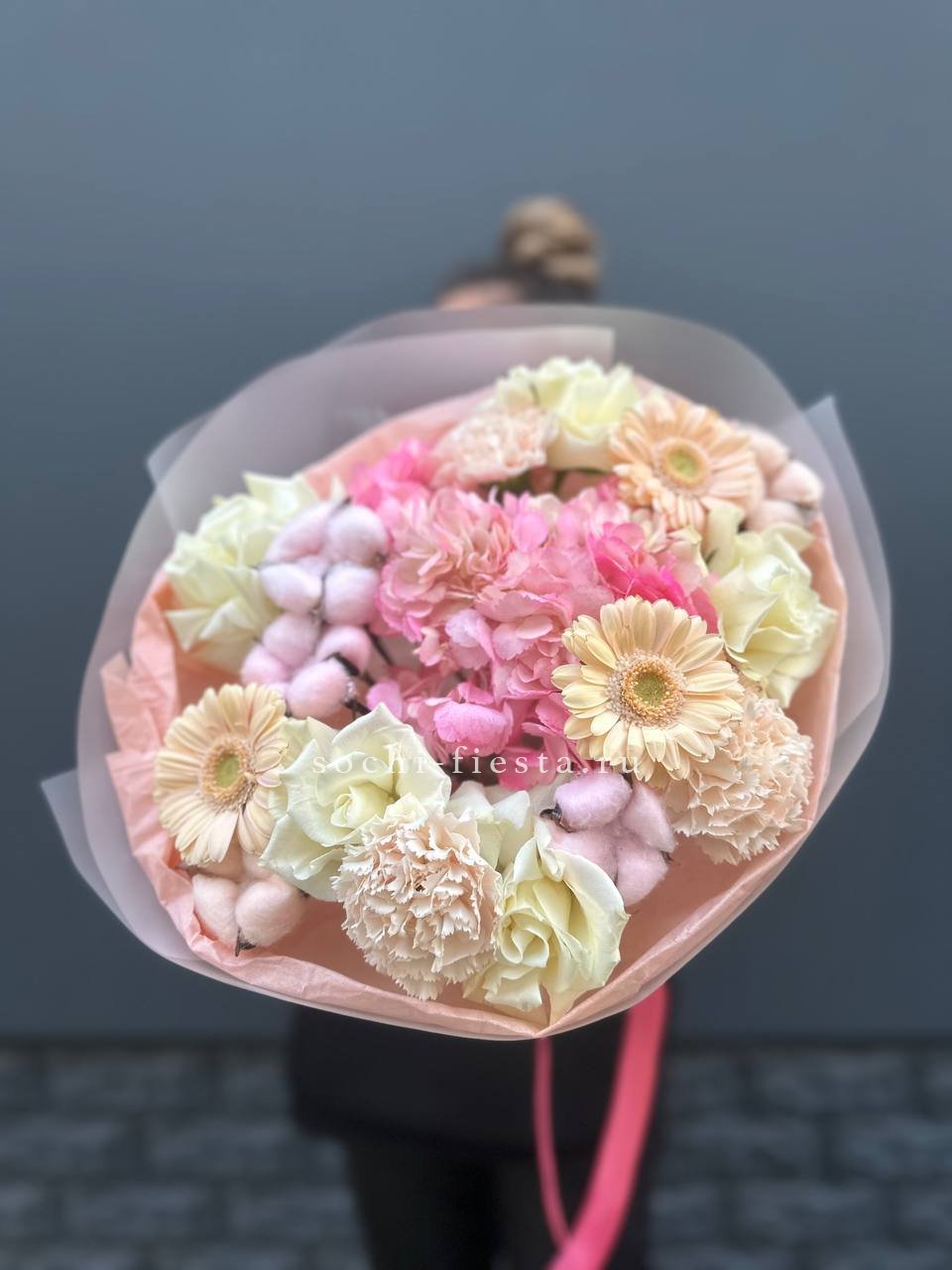 Здесь идеально сочетаются крупные, бархатистые бутоны роз, облака гортензии и мелкие акцентные цветы. Получилась невероятно воздушная и легкая композиция, которая мгновенно создает ощущение праздника и весеннего настроения. Стильный бант завершает этот изысканный образ.
