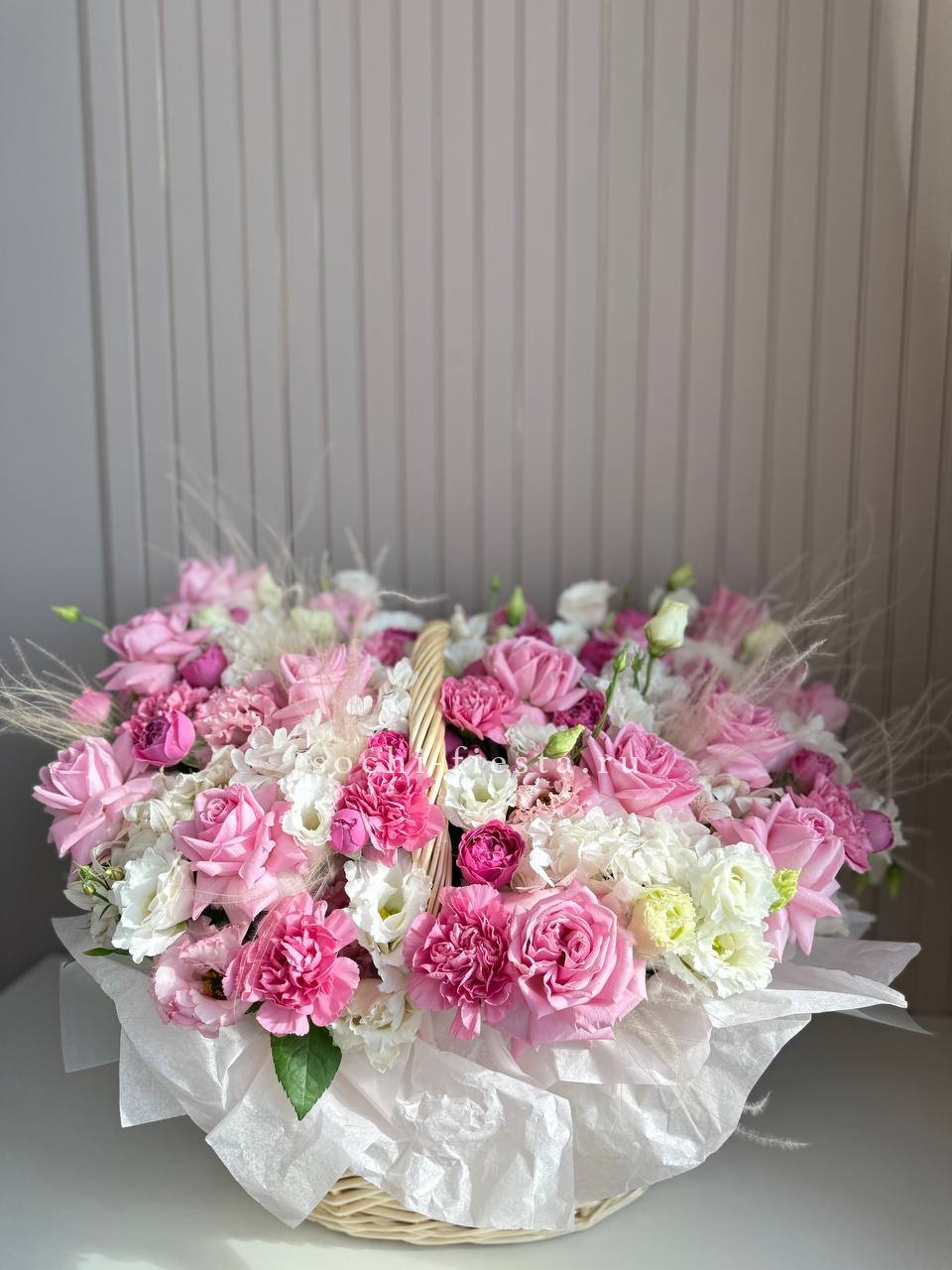 герберы, рзовая роза, диантус, озотамус, мисти баблс, бомбастиу, корзина малая.