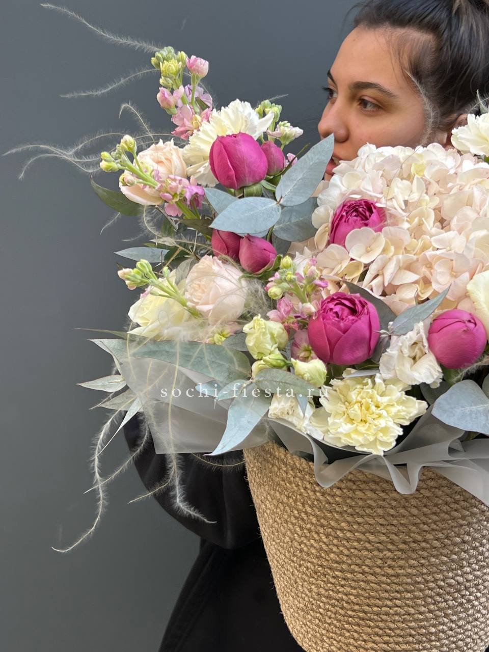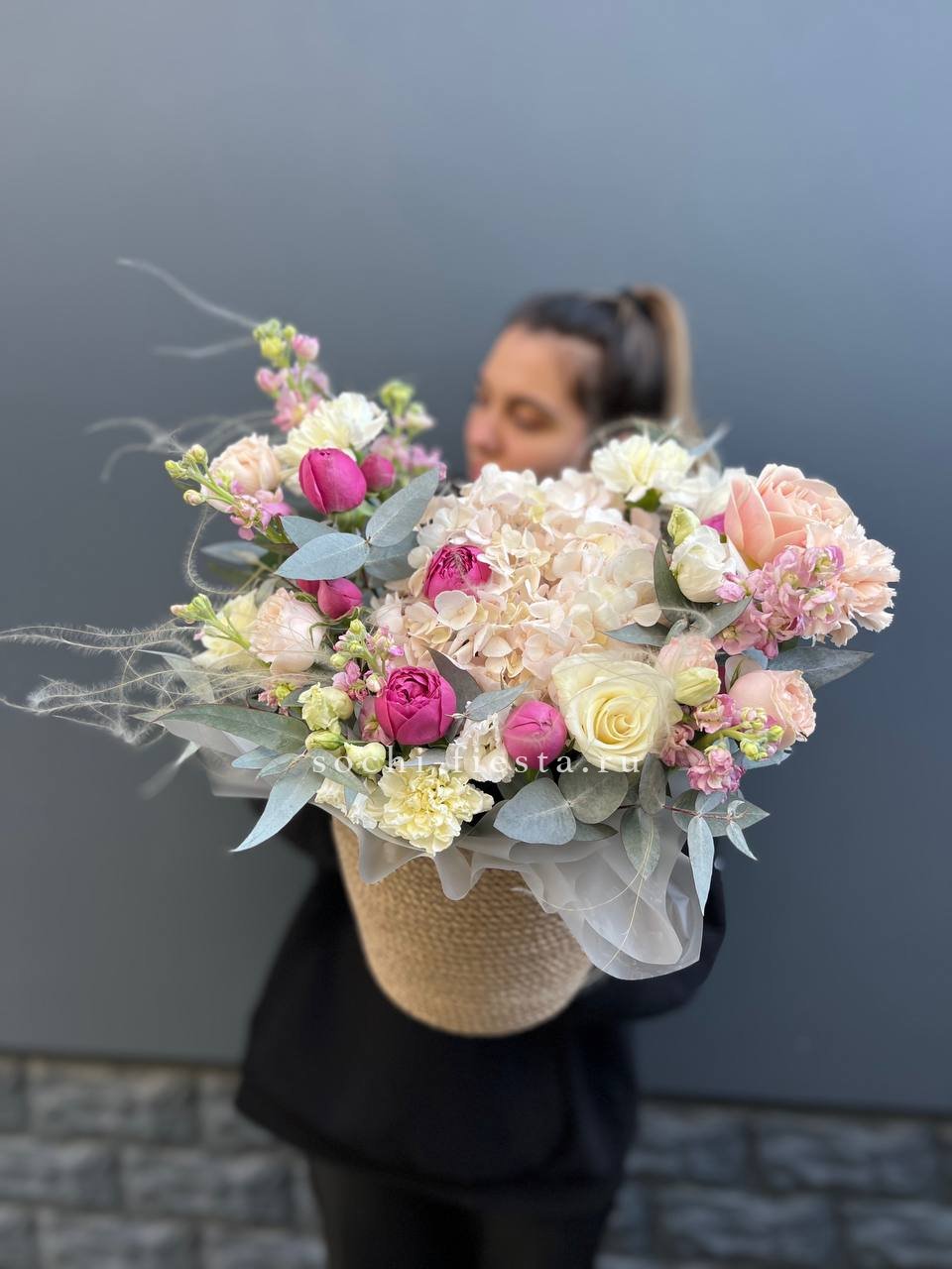 Плетеная корзина вмещает густую композицию из лилий с добавлением эвкалипта. Объемная форма создает впечатление цветущего сада, собранного в одном месте.