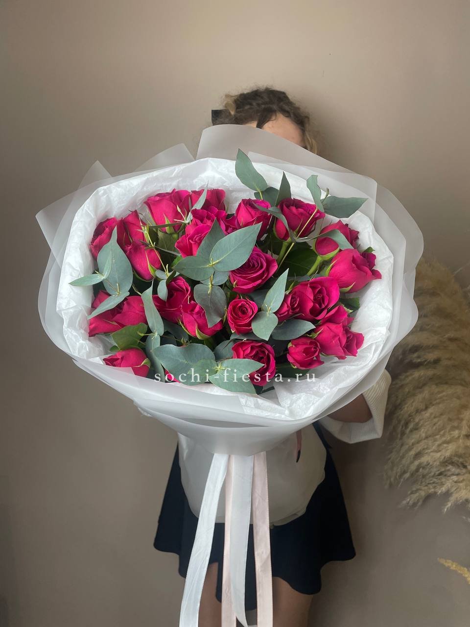 розы, диантусы, пионовидные кустовые розы, гортензия, эвкалипт, вспомогательная зелень, лента, дизайнерская упаковка.