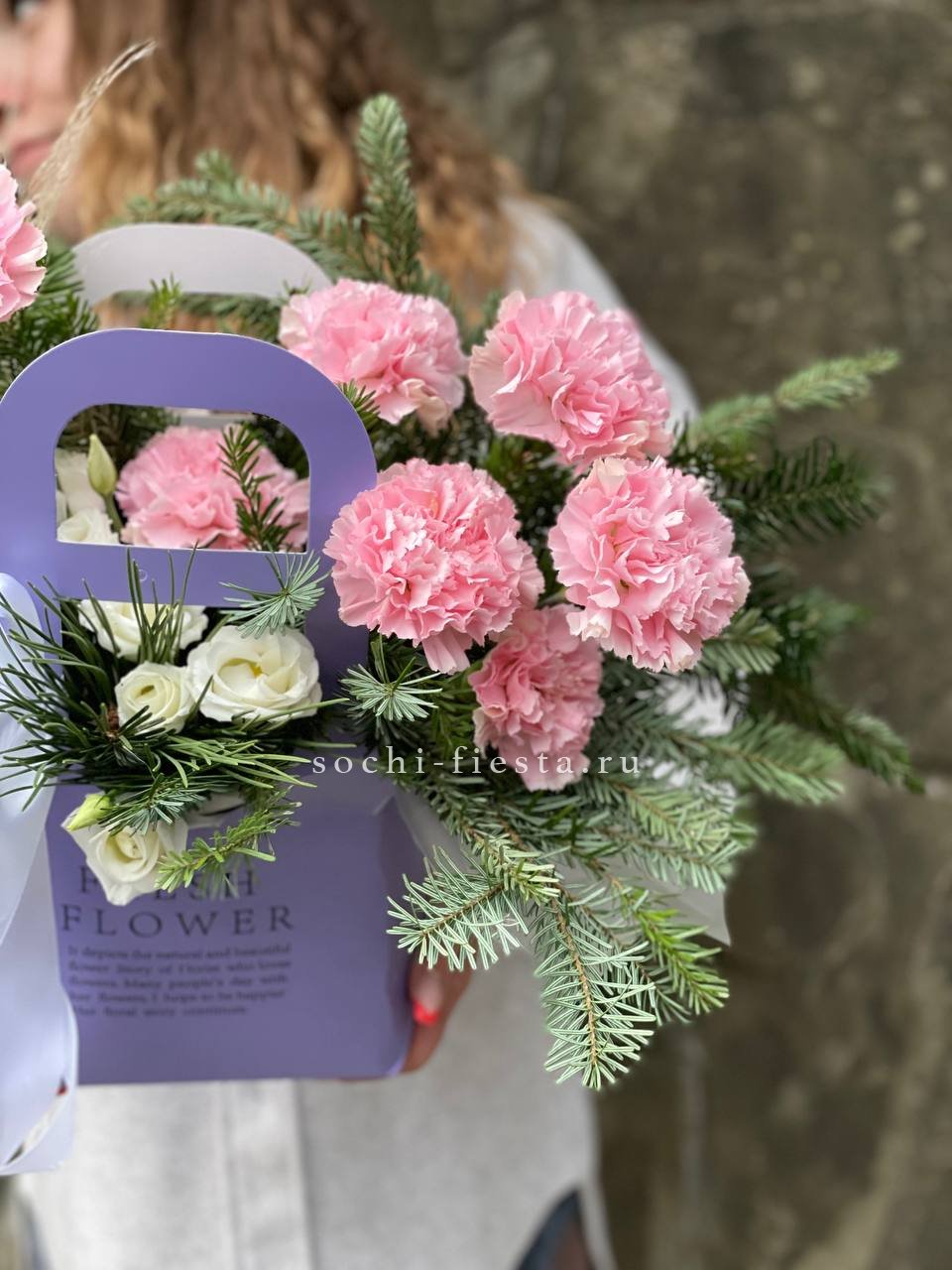 Диантусы и эустомы соседствуют с веточками нобилиса в компактной сумочке. Пампасная трава вносит мягкую текстуру, а лента фиксирует форму и добавляет завершённость композиции.