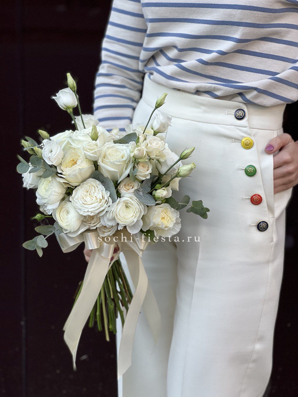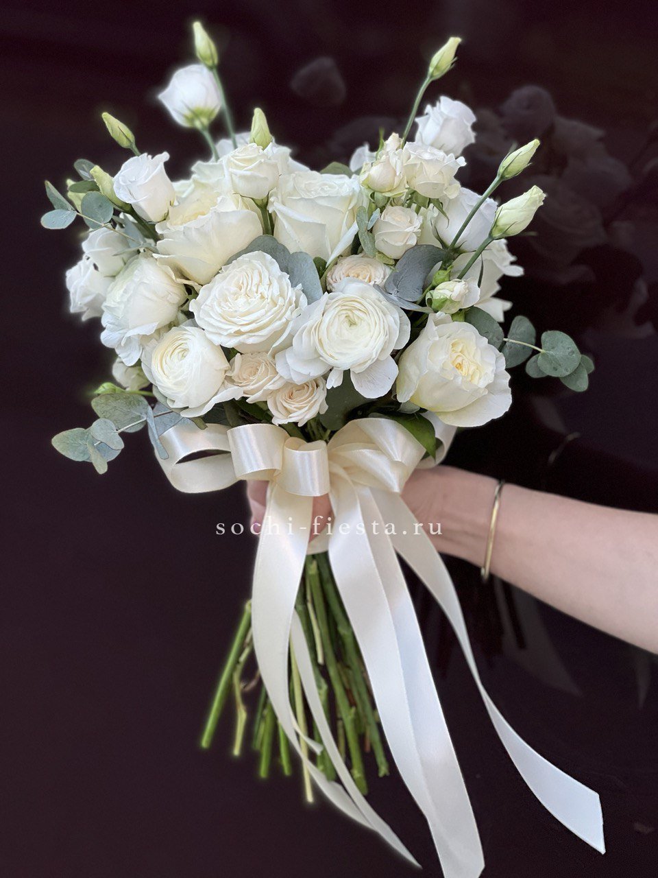 Девятнадцать бутонов эустомы раскрываются слоями воздушных лепестков создавая мягкую текстурную глубину. Эвкалипт добавляет свежести этому монохромному свадебному решению.