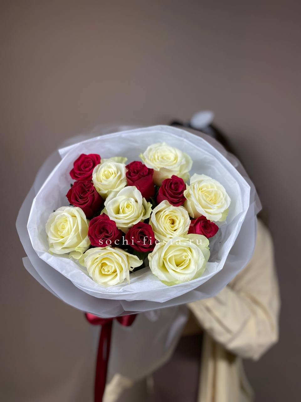 Для заказа товара "Букет из красных белых 15 роз" с доставкой в Екатеринбурге нажмите в корзину