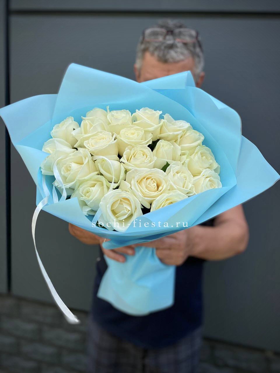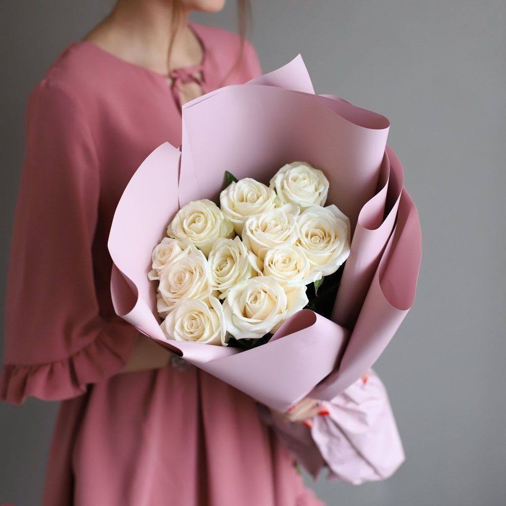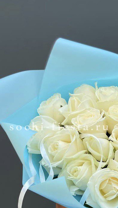 Пятнадцать белых роз в тонкой дизайнерской упаковке создают ощущение лёгкости и чистоты. Матовая текстура бумаги и мягкие складки подчёркивают форму каждого бутона. Композиция выглядит свежо и современно.