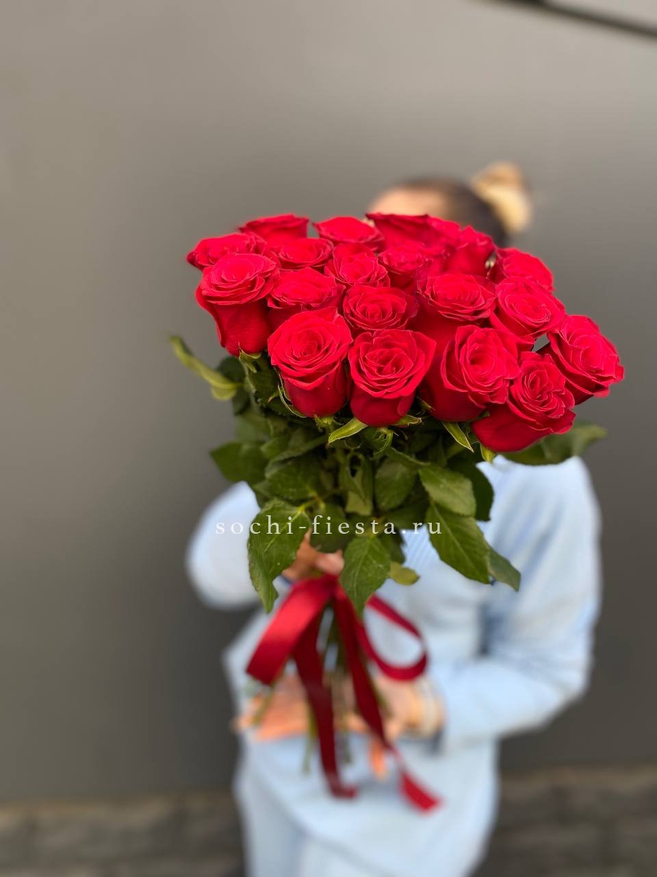 Девятнадцать бутонов насыщенного алого оттенка собраны в плотную композицию и перевязаны лентой. Классическая форма букета сохраняет свежесть и яркость надолго.