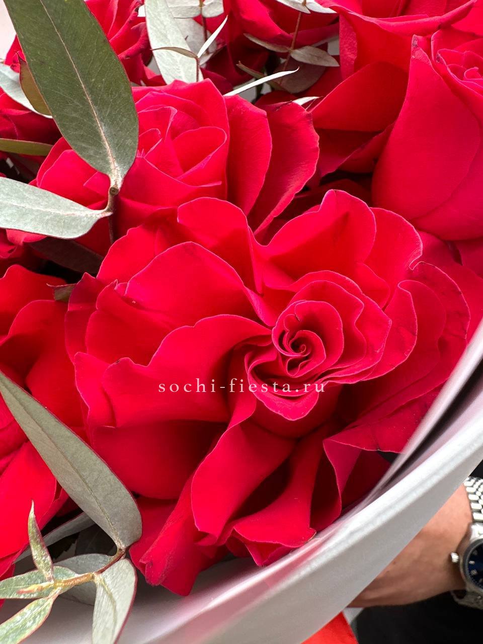 Одиннадцать французских роз с вывернутыми лепестками раскрывают всю глубину бутона. Насыщенный красный цвет и графичная форма создают яркое присутствие.