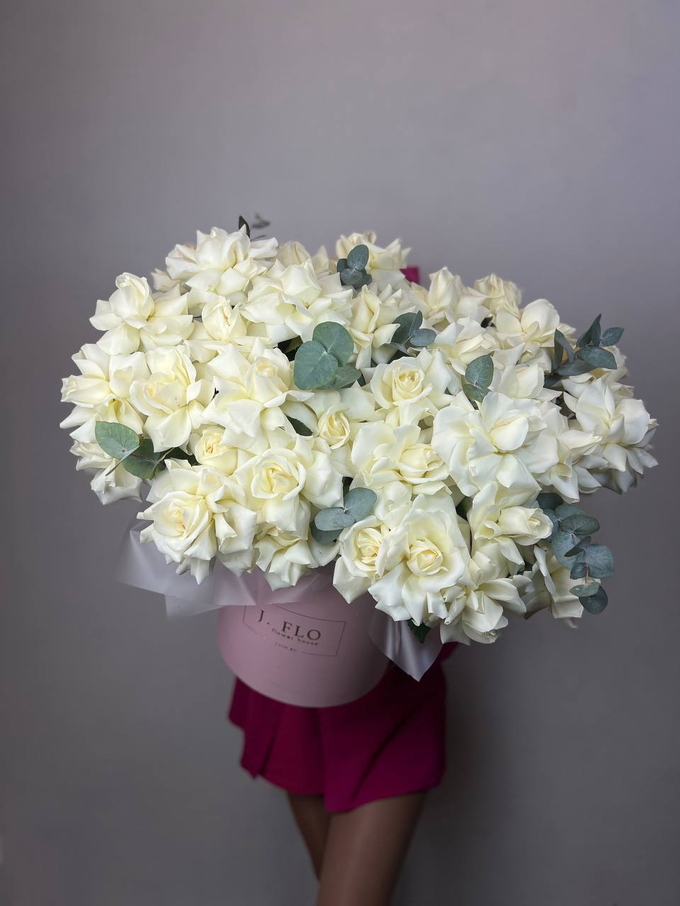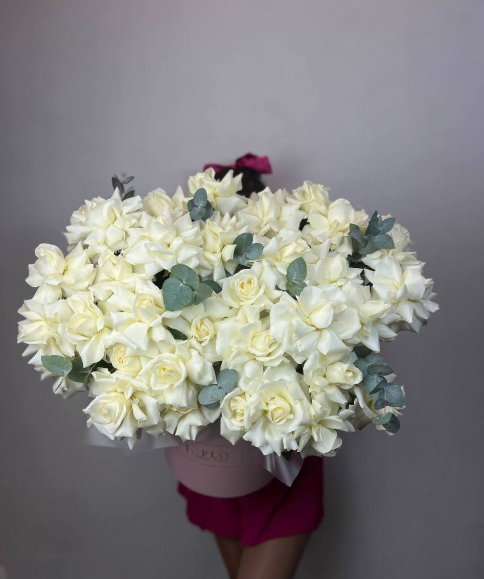 Пять французских роз с вывернутыми лепестками раскрываются широко и создают эффект лёгкой небрежности. Эвкалипт поддерживает форму и добавляет свежести белому цвету.
